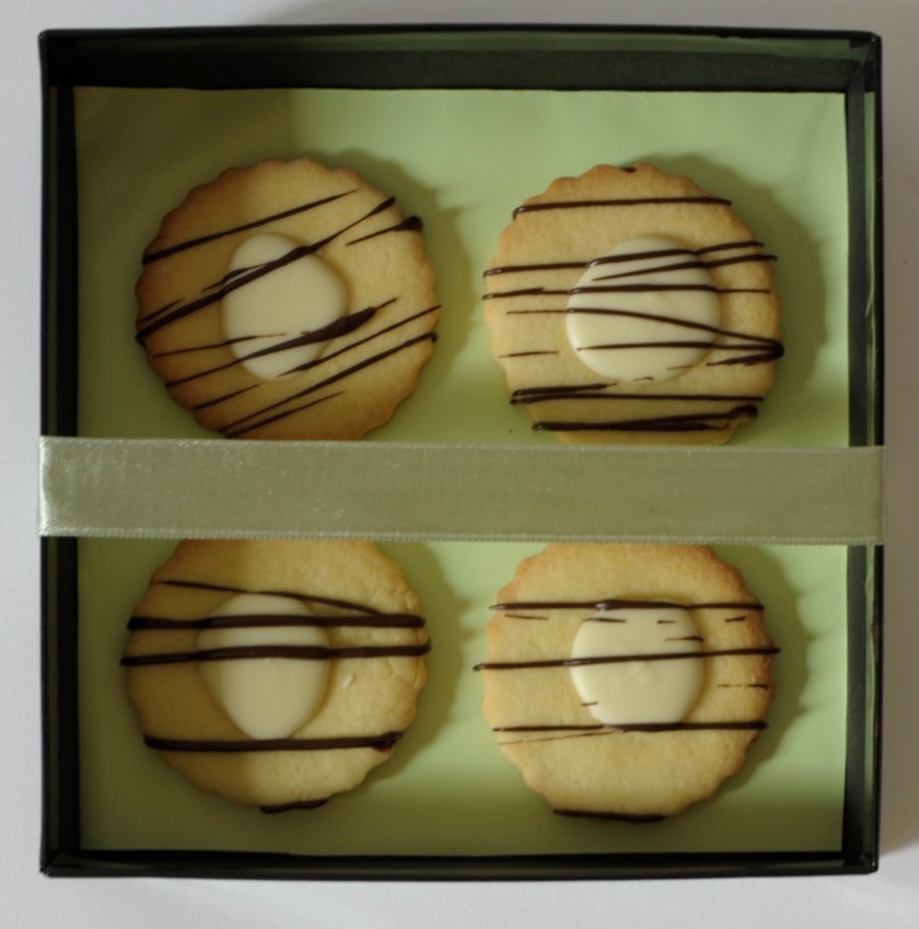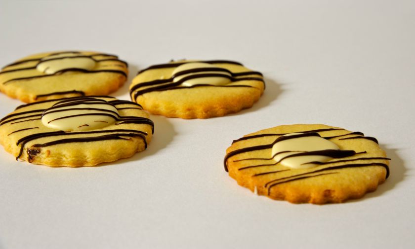 Tolti dal forno, devono essere appena dorati ai bordi, vanno fatti raffreddare. Tenerli sulla stessa teglia, ben allineati tra loro. Nel frattempo si può fondere il cioccolato, prima quello bianco, direttamente dentro un pentolino a fuoco bassissimo, mescolando bene e di continuo. Con un cucchiaino da caffè, far colare al centro di ogni biscotto del cioccolato. Una volta ‘conditi’ tutti i biscotti, muovere la teglia delicatamente in modo da livellare il cioccolato bianco. Lasciar raffreddare per almeno un’ora. A questo punto fondere a bagno maria anche il cioccolato fondente. Porre il cioccolato in un piccolo cono ricavato da un rettangolo di carta da forno e passarlo poi orizzontalmente, avanti e indietro, su tutti i biscotti, con gesti veloci e ripetitivi, senza spremere troppo. In alternativa si può usare una forchetta al posto del cono, intingendola nel cioccolato e poi muovendola nello stesso modo. Il risultato sarà meno regolare, ma altrettanto piacevole. Buoni biscotti a tutti (soprattutto a tutti i single pasquali, come me).