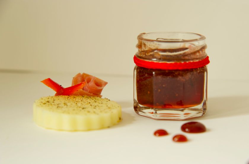 Oggi non sono andata in ufficio per colpa di una forte sinusite, quindi dopo il dottore, ho deciso di consolarmi con uno spuntino a base di formaggio, accompagnato con la Marmellata di Fragole e Peperoni. Io la uso indifferentemente insieme a stuzzichini salati o torte e biscotti dolci. Ha un sapore molto particolare, ma per i palati coraggiosi e senza pregiudizi è di certa soddisfazione.