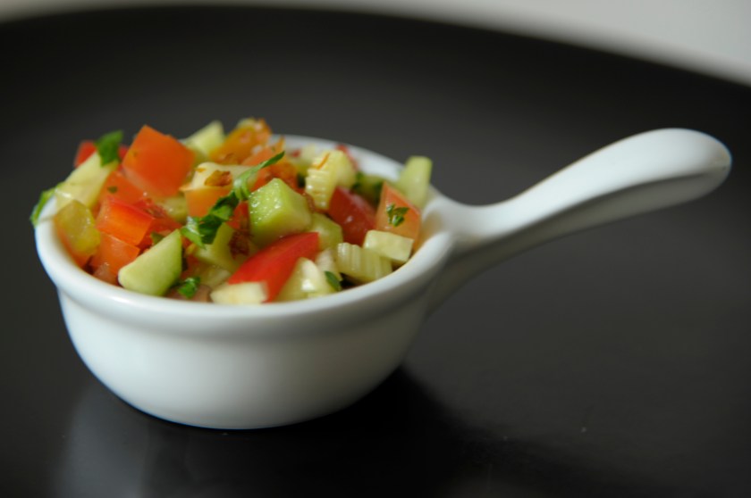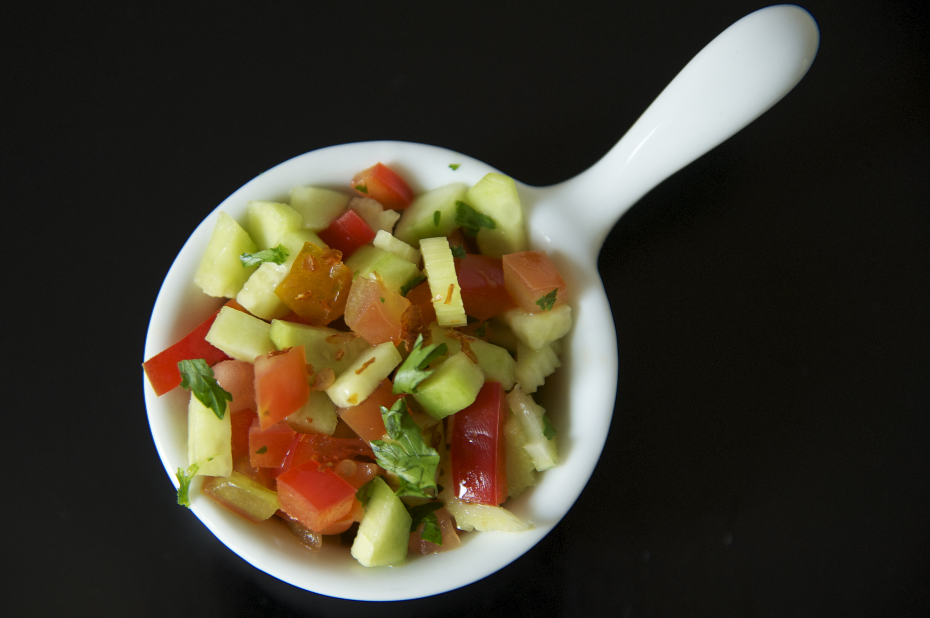 Che ricetta è? Tagliate le verdure a dadini molto piccoli, dopo averle pulite bene. Attenzione con i pomodori, bisogna svuotarli dei semi con un coltellino ed utilizzare solo la polpa. Mischiate tutto il cubettame e conditelo con olio, sale, pepe, qualche goccia di limone e il prezzemolo tritato. Spolverate l’insalatina con il peperoncino.