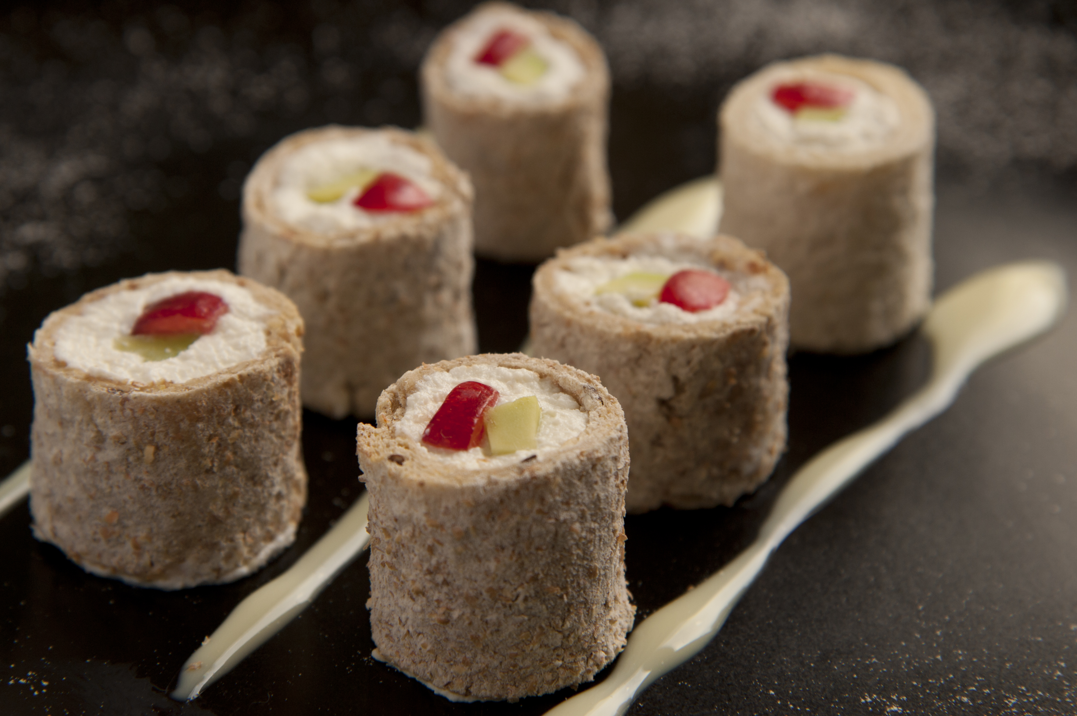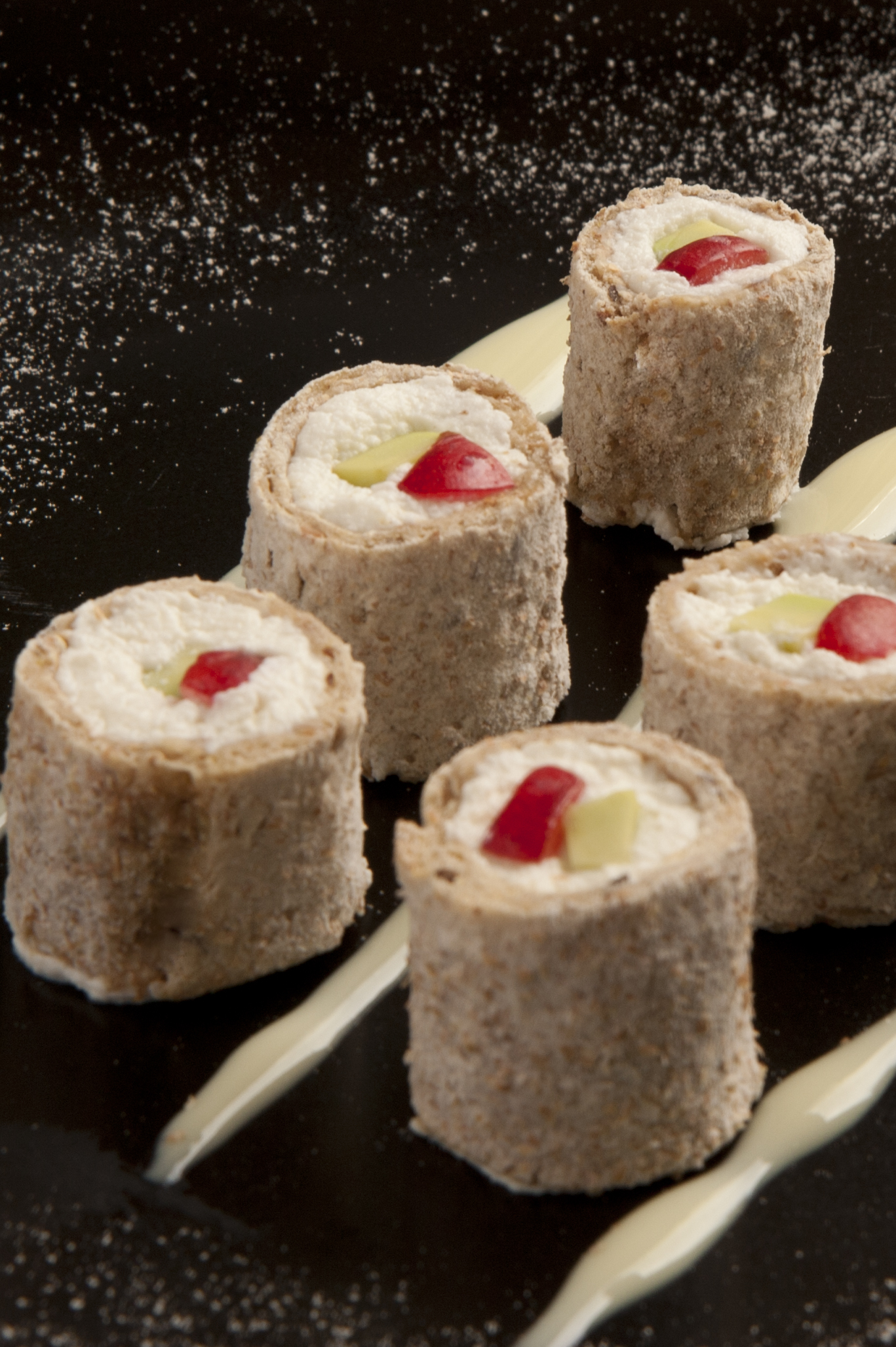 Preparare un piano di lavoro che lasci spazio di manovra e un bel tagliere cosparso di zucchero a velo (e spolverare lo zucchero ogni volta che si lavorerà su una fetta di pane). Spennellare la prima fetta di pan carrè con poco latte, molto velocemente, appoggiarla sullo zucchero a velo e stenderla bene con un mattarello. Tagliare i bordi del pane, tagliare la fetta a metà per il lungo e arrotolare la striscia in modo da ottenere un piccolo cilindro. Per far aderire le estremità, intingerne una nel latte, subito prima di formare il cerchio. Premere bene la giuntura con le dita e adagiare su una teglia rivestita di carta da forno e passare le due estremità del cilindro nello zucchero (40 gr sono destinati a ciò e 40 li mescoleremo alla ricotta). Ripetere l’operazione fino ad ottenere 12 cilindri. Accendere il forno a 180° e lasciar dorare i mini maki (vuoti) per 10 minuti. Nel frattempo mescolare la ricotta con lo zucchero. Una volta pronti i maki farcirli con la ricotta (più facile di quanto possa sembrare, basta un cucchiaino oppure la magica sac à poche). Livellare la ricotta e decorare ogni maki inserendo al loro interno una fettina di avocado ed una di ciliegia verso il lungo, in modo che la frutta resti visibile all’estremità superiore. Nulla di sensazionale, ma per accompagnare un dessert più importante fanno la loro figura. Possono essere farciti e decorati con qualsiasi tipo di frutto e la ricotta può essere arricchita con gocce di cioccolato. A breve la versione salata.