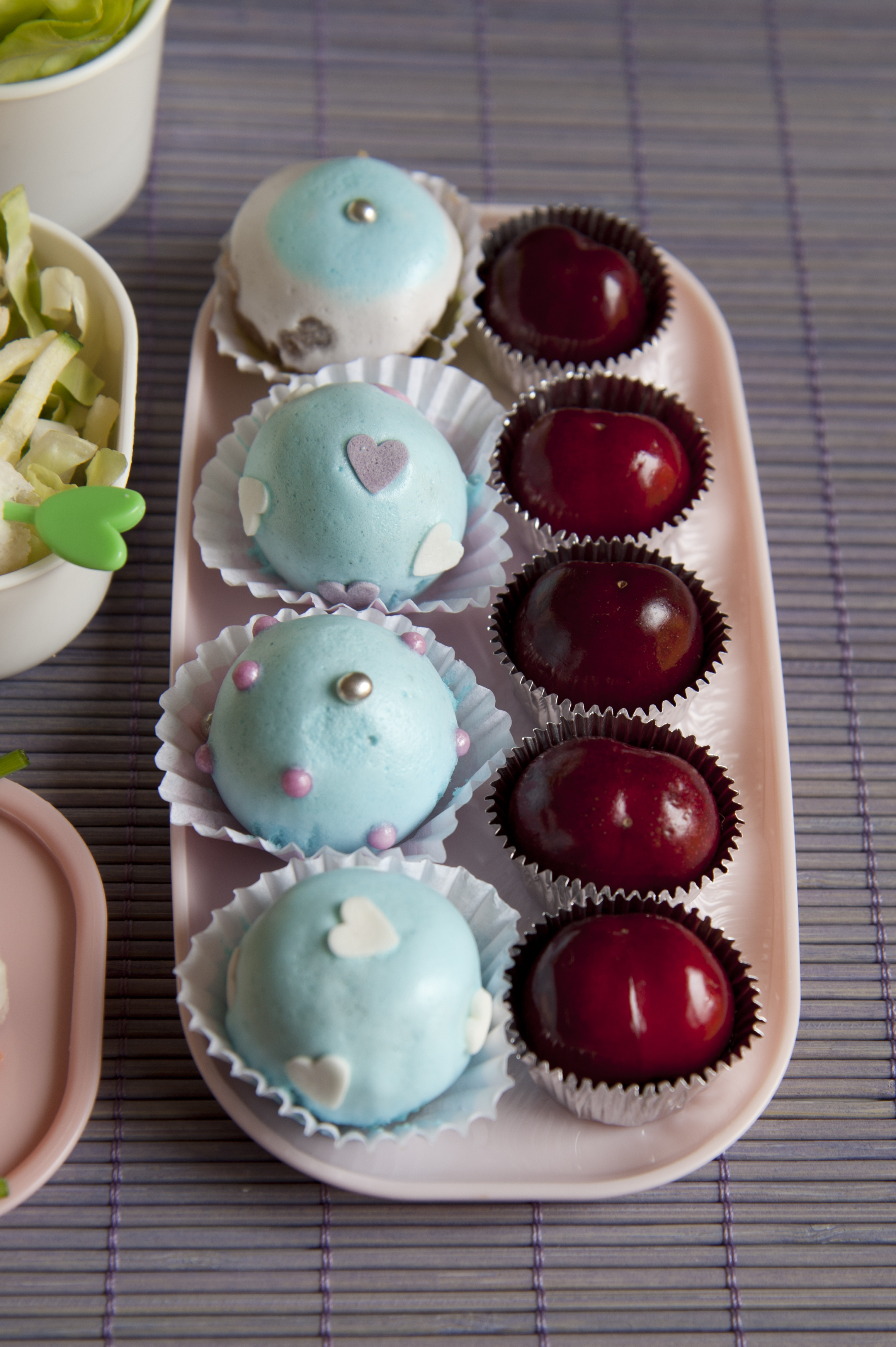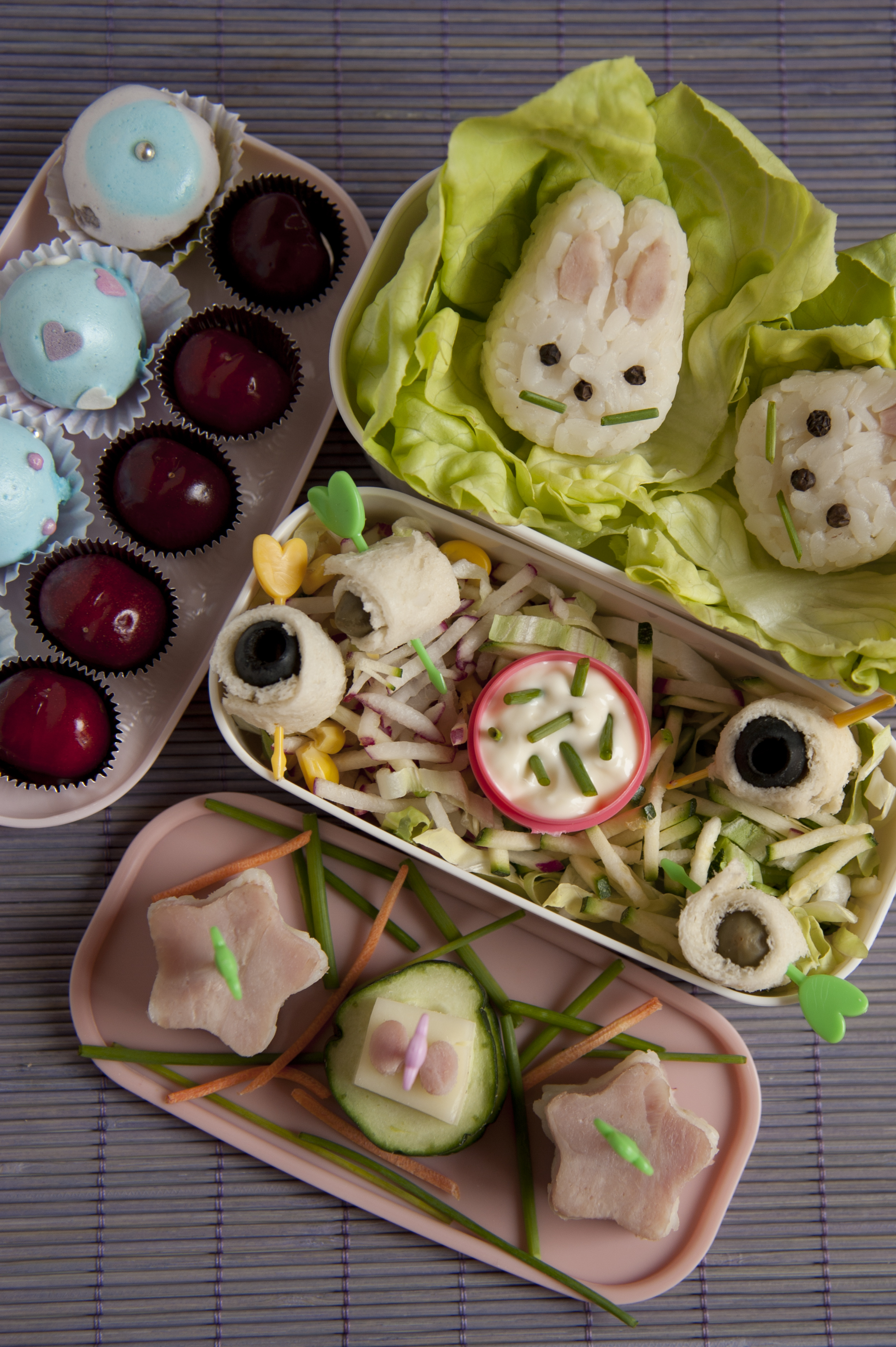 Questo è il mio bento, composto da ingredienti davvero semplicissimi: riso, insalata, prosciutto cotto, cetrioli, formaggio e olive. Per dessert: cake pop al cioccolato e ciliegie. Non avevo mai partecipato ad un contest, grazie al quale ho scoperto le gioie del bento :) ma soprattutto del riso a forma di coniglietto. Stasera devo proprio organizzarmi per uscire, un’altra serata sola tra queste quattro mura e non sarà più il mio blog a potermi salvare! Ok, adesso sento le mie sciamannate amiche per organizzare qualcosa.