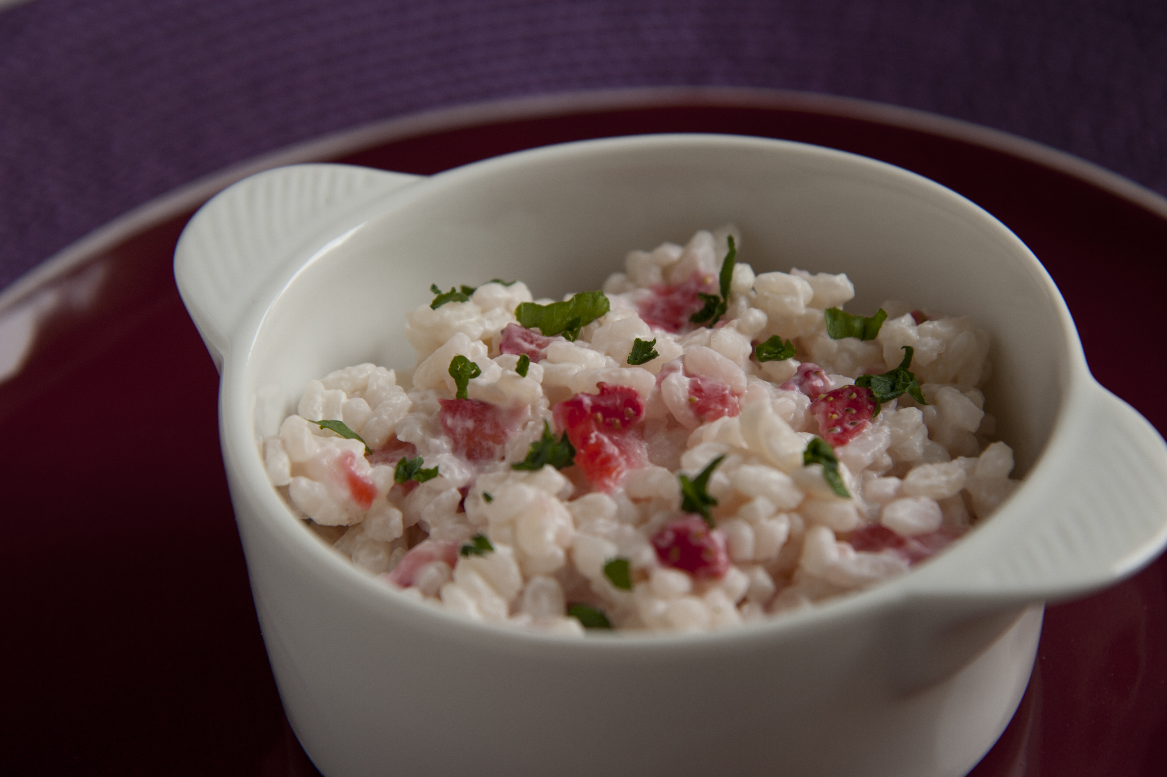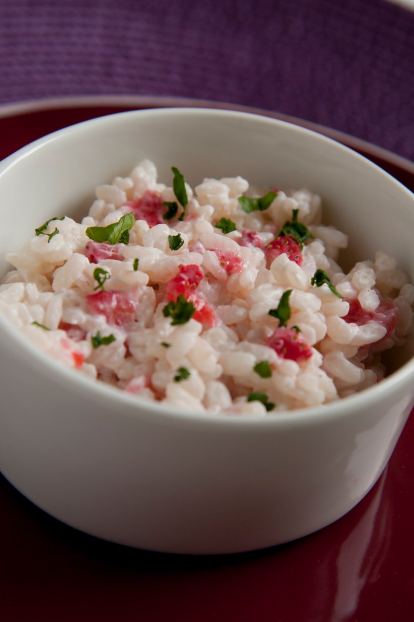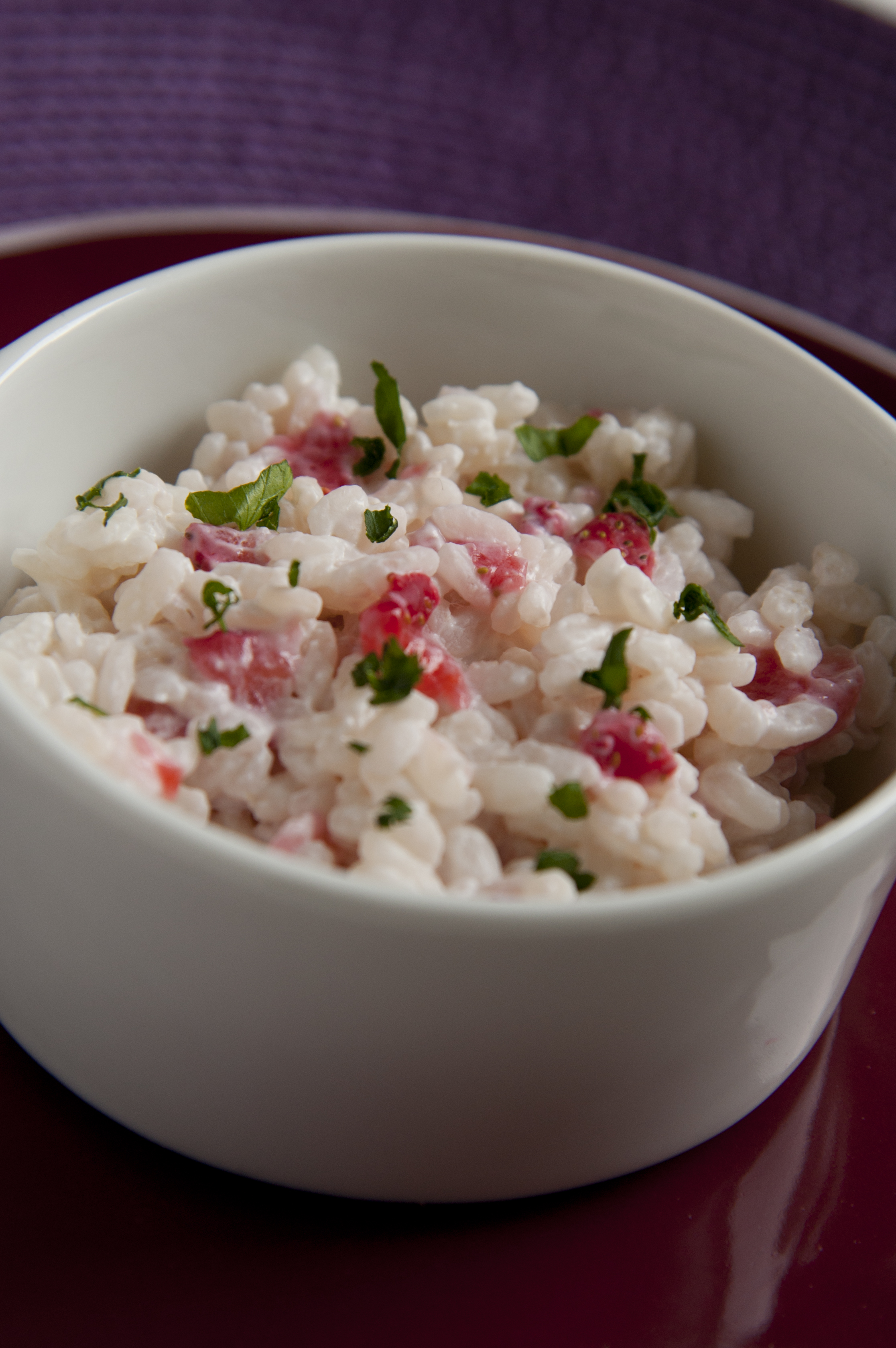 Soffriggere la cipolla insieme ad una noce di burro. Unire il riso e farlo rosolare qualche minuto, mescolando. Alzare la fiamma e sfumare con il vino bianco. Lasciar cuocere il riso aggiungendo il brodo, un mestolo alla volta man mano che si asciuga. Nel frattempo tagliare le fragole a cubetti piccoli, unirvi la panna, del prezzemolo tritato, amalgamare dolcemente il tutto. Una volta pronto il risotto unirvi le fragole e la panna. Mescolare e aggiustare il tutto di sale e pepe (usando il brodo naturale e non quello di dado occorre essere generosi con il sale). Cospargere di formaggio grattugiato, una noce di burro e lasciar mantecare qualche minuto a pentola coperta. Dividere nei piatti di portata e decorare con altro prezzemolo tritato. Il sapore è particolare, me ne rendo conto, ma fa sempre la sua figura ed è semplice e veloce da realizzare.