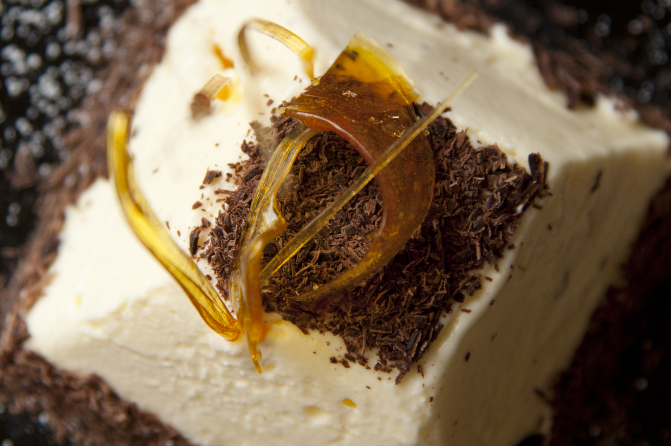 Ho aggiunto solo 100 gr di zucchero con il quale ho preparato il caramello, che ho steso su un foglio di carta forno oleata e che poi ho introdotto a pezzettini nell’impasto e che ho usato anche per la decorazione, insieme a del cioccolato fondente grattugiato. In un pentolino ho sciolto lo zucchero nell’acqua a fuoco dolce e appena spenta la fiamma ho unito il cioccolato bianco. Ho mescolato con la frusta, l’impasto risulta grumoso e appiccicoso, ma la situazione migliora una volta aggiunti i tuorli delle uova (occorre lasciar intiepidire il cioccolato prima). Quando la crema di cioccolato bianco si è raffreddata ho aggiunto la panna, montata nella planetaria insieme a due cucchiai di zucchero. Infine ho unito gli albumi montati a neve.