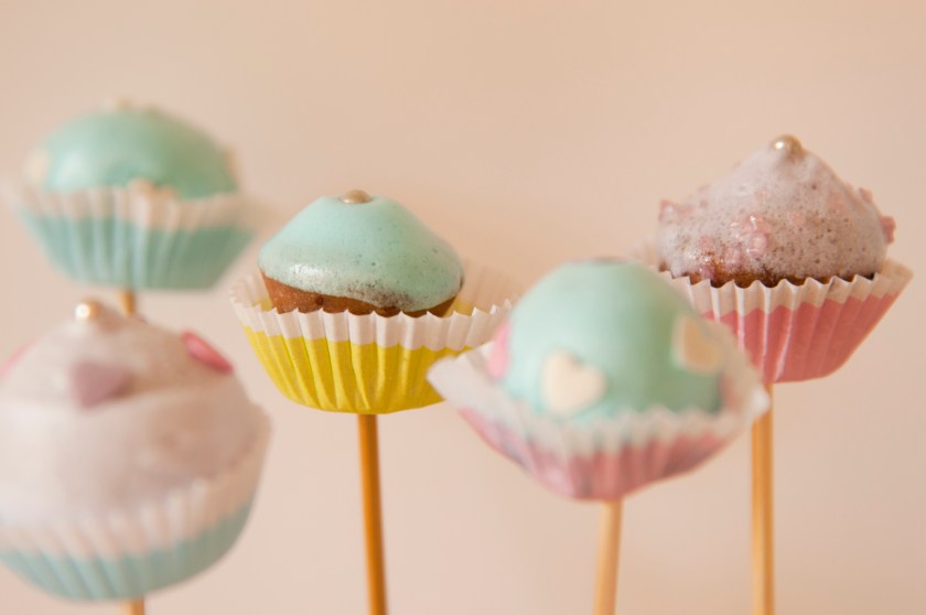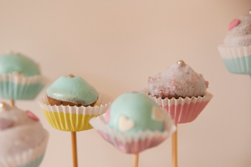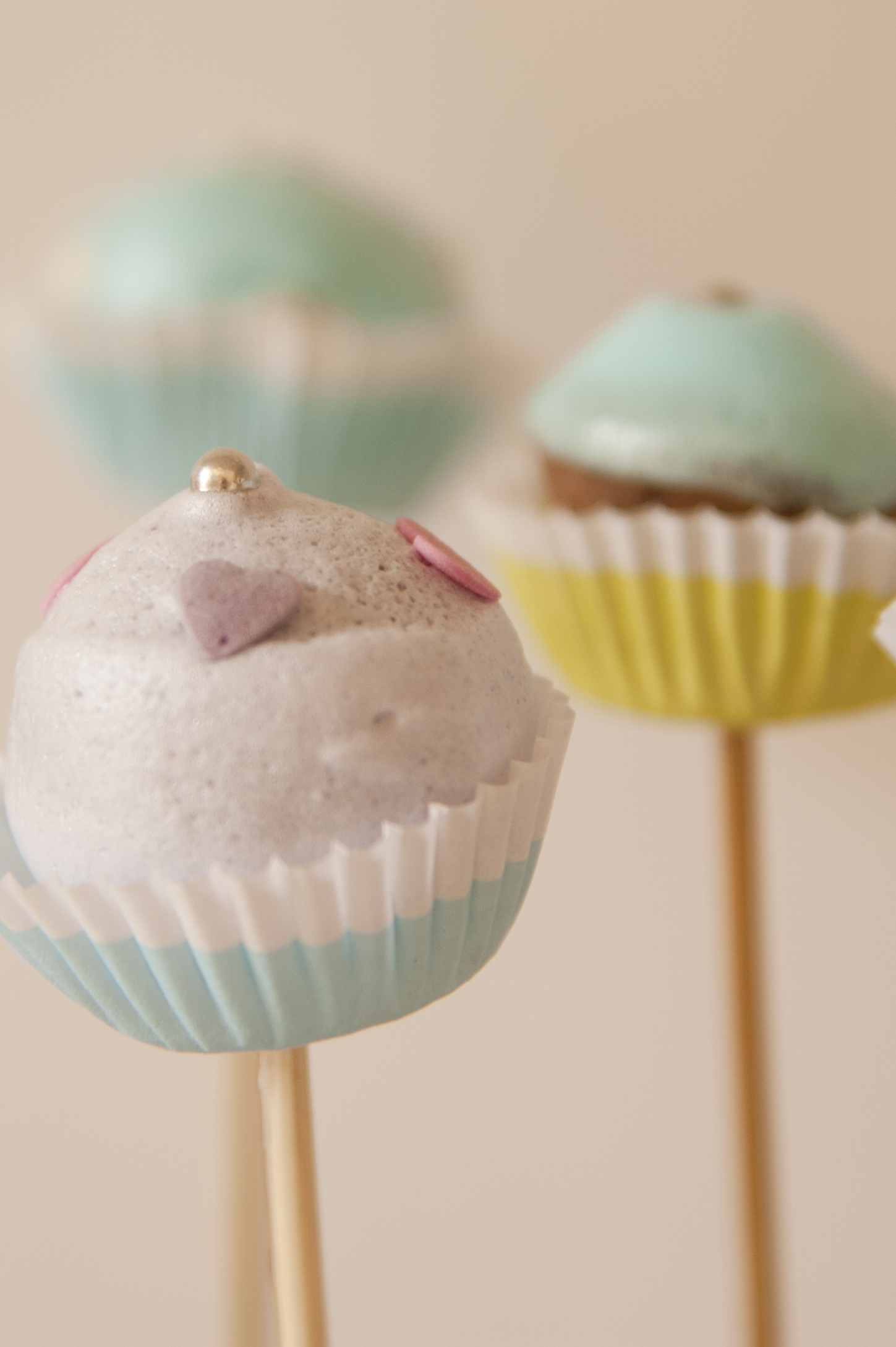 Frullare i biscotti. Quelli che avete, anche se non sono più croccanti. Aggiungere un cucchiaio abbondante di formaggio e un pezzo di burro (40 gr). Frullare ancora. Le dosi sono ad occhio, dipende tutto dal tipo di biscotto usato. Deve risultare un impasto omogeneo, ma burroso e malleabile, come una pastafrolla. Con l’impasto dei biscotti formare delle palline e poi schiacciarle dalla metà in giù della loro circonferenza. L’idea è ricreare la forma dei muffin. Inserire alla loro base uno stuzzicadenti di quelli lunghi dalla parte senza punta e mettere in frigorifero a riposare almeno 2 ore, appoggiandoli delicatamente su un vassoio. Preparare la glassa: in una ciotolina mettere lo zucchero a velo, unire dell’acqua, pochissima, in tutto forse 2 cucchiai (non so dare una indicazione più precisa) e mescolare bene. Unire un cucchiaio di albume montato a neve e mescolare ancora. La glassa deve essere morbida e spumosa. Dividerla in tre parti e colorarla con qualche goccia di coloranti alimentari (io li ho comparati su internet in pasta: decora.it, lilla, blu e rosa. Ne serve verameramente una sola goccia per ottenere i colori tenui che vedete nelle foto). Decorarli con stelline e cuoricini vari. Infilzare gli stuzzicadenti sul coperchio di una scatola da scarpe, per tenerli dritti, e farli asciugare per una notte. Il giorno dopo inserire i pirottini dal basso, forandoli con la punta degli stuzzicadenti su ognuno dei quali ci sarà un mini-muffin.
