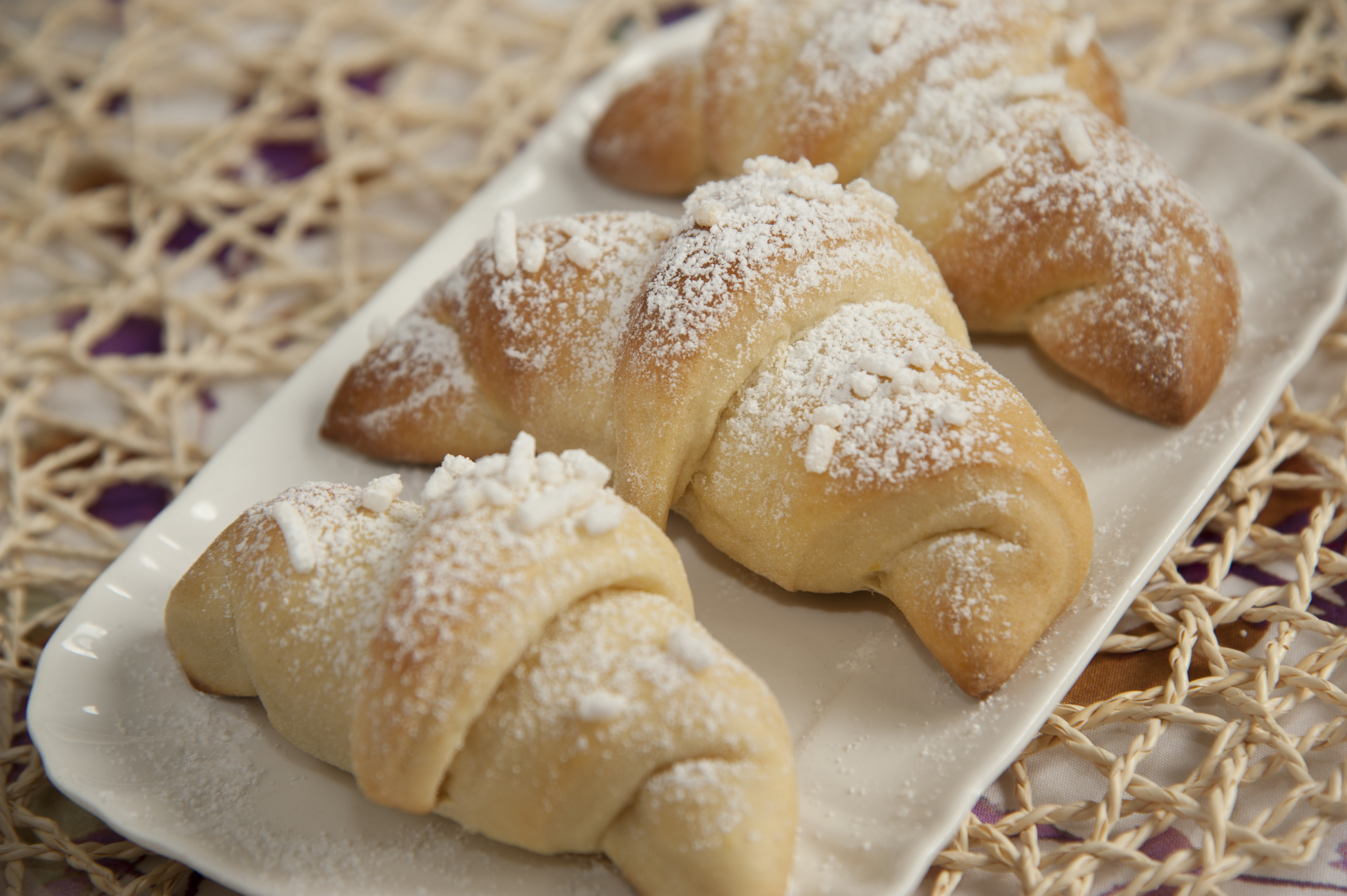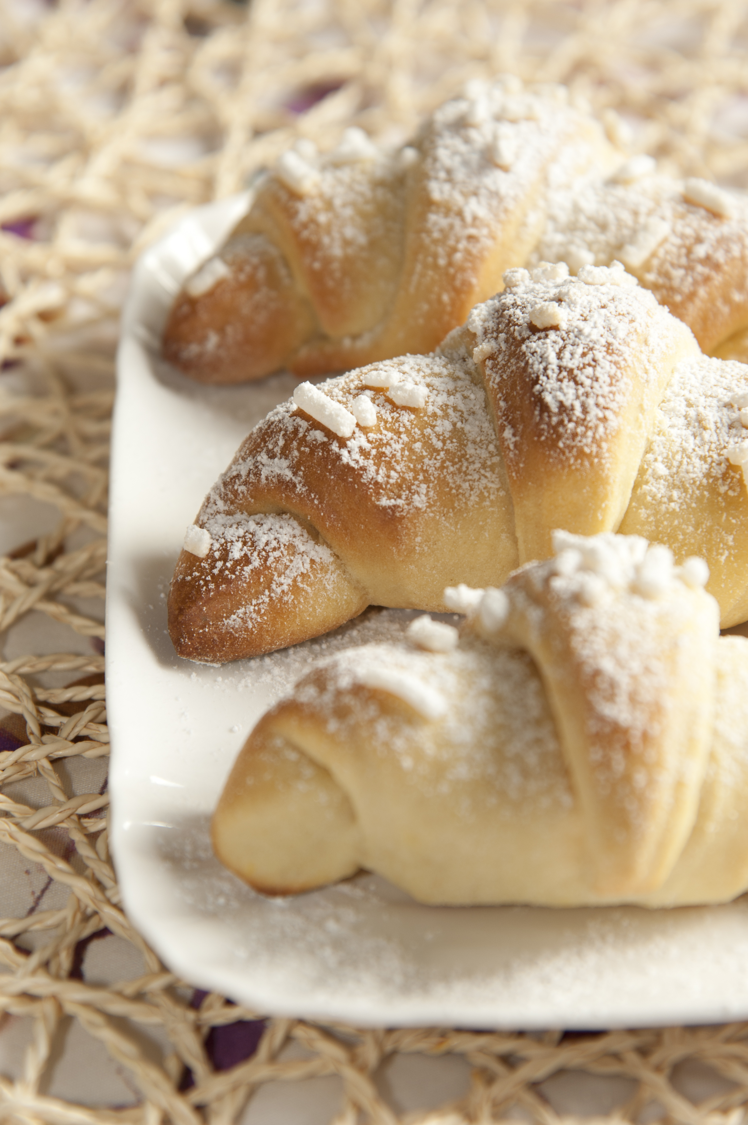 Questa è una ricetta un po’ faticosa e di cui non posso assicurare la riuscita se non si possiede una buona impastatrice. Però nessuno vieta di provare a realizzarla a mano o con un qualsiasi robot da cucina. Queste brioches, e lo dico per onestà intellettuale, fanno la loro figura appena sfornate ed il giorno stesso. Già dopo una notte tendono a diventare gommose. La soluzione è congelarle una volta cotte e scaldarle al momento del bisogno (per esempio un risveglio romantico. Non avendo questa esigenza, le ho mangiate tutte appena sfornate. Erano buone!). Sciogliere il lievito nel latte tiepido e mettere il composto in una grande ciotola. Aggiungere alla miscela la farina e mischiare. Unire il burro a temperatura ambiente, lo zucchero, l’aroma e le uova. Dopo aver amalgamato appena gli ingredienti, unire il sale. Impastare tutto a lungo, almeno 10 minuti, se l’impasto risulta troppo duro aggiungere qualche cucchiaio di latte, al contrario aggiungere un po’ di farina. Lasciare lievitare per 2/3 ore in luogo tiepido e asciutto (e quale sarà mai? Nel dubbio, prediligo il forno spento). Prendere l’impasto e stenderlo con un mattarello dello spessore di 1,5 cm. Tagliare dei tringoli (un lato più corto e 2 più lunghi ed uguali). Tenendo il alto corto verso di se, arrotolare i triangoli verso la punta. Dare la tipica forma del cornetto ripiegando le due punte laterali della brioche e lasciare lievitare altri 30 min. Spennellare con il latte e spolverare con la granella di zucchero. Infornare a 190° per 40/45 min. Sfornare, lasciare intiepidire e spolverarle di zucchero a velo.