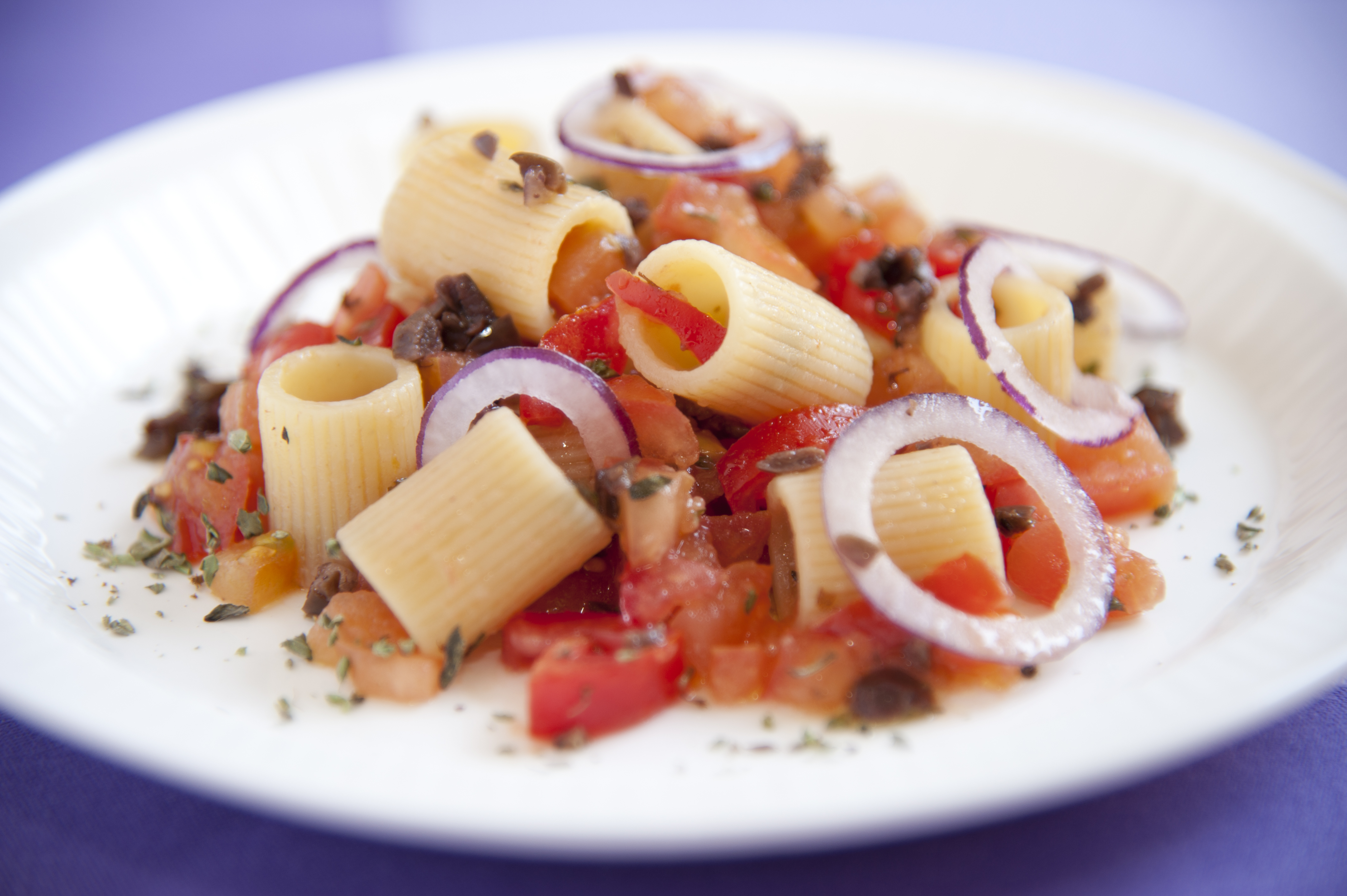 Mettere le olive in un bicchiere, aggiungere 2 cucchiaio di olio, i capperi lavati, un pizzico di origano e tritare finemente il tutto con una forbice. Sbollentare i pomodorini, sbucciarli e tagliarli a metà. Spremerne il succo nel pesto di olive e mescolarlo, tagliare poi la polpa dei pomodori a cubetti. Affettare la cipolla a rondelle e aggiungerla ai pomodori, conservandone 8 tra le più piccole. Irrorarli di olio e condire con sale e origano. Mescolare e lasciar riposare in frigo per un’oretta. Cuocere la pasta, nel frattempo mettere i pomodori in padella e scaldarli a fuoco vivo per 2 minuti. Aggiungere la pasta scolata, mescolare ancora ed impiattare. Ad ogni piatto aggiungere un paio di cucchiai di pesto di olive e un paio di rondelle di cipolla fresche. Cospargere di origano e servire.
