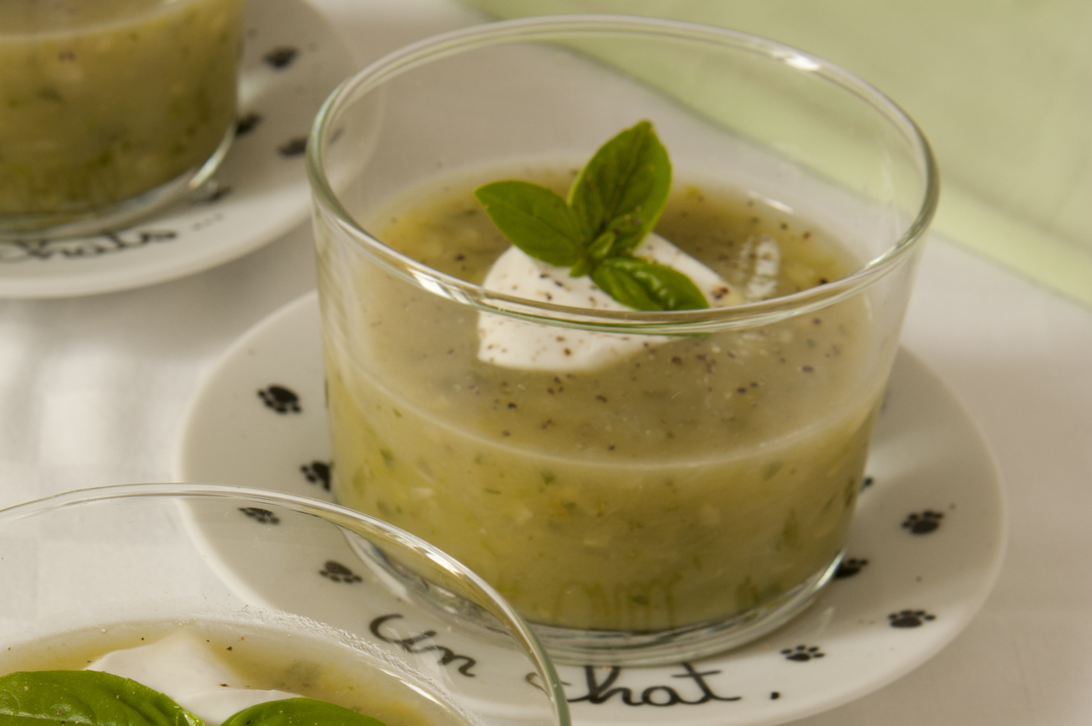 Tagliare la cipolla e soffriggerla nell’olio. Aggiungere la patata sbucciata e tagliata a cubetti e dopo 10 minuti aggiungere le zucchine tagliate a dadi, salare. Lasciar cuocere bene il tutto, mescolando spesso. Mettere la verdura intiepidita nel bicchiere del minipimer o nel frullatore, aggiungere le foglie di basilico, i pinoli e il formaggio. Dopo aver fatto amalgamare gli ingredienti aggiungere lo yogurt conservandone 4 cucchiai. Il composto deve avere la consistenza di una crema, se risulta troppo solido, aggiungere poca acqua intiepidita. Condire con sale e pepe a piacere e frullare ancora. Servire la crema appena tiepida, dentro ciotole o bicchieri di piccole dimensioni e decorando con un cucchiaio di yogurt, una spolverata di pepe ed una foglia di basilico.