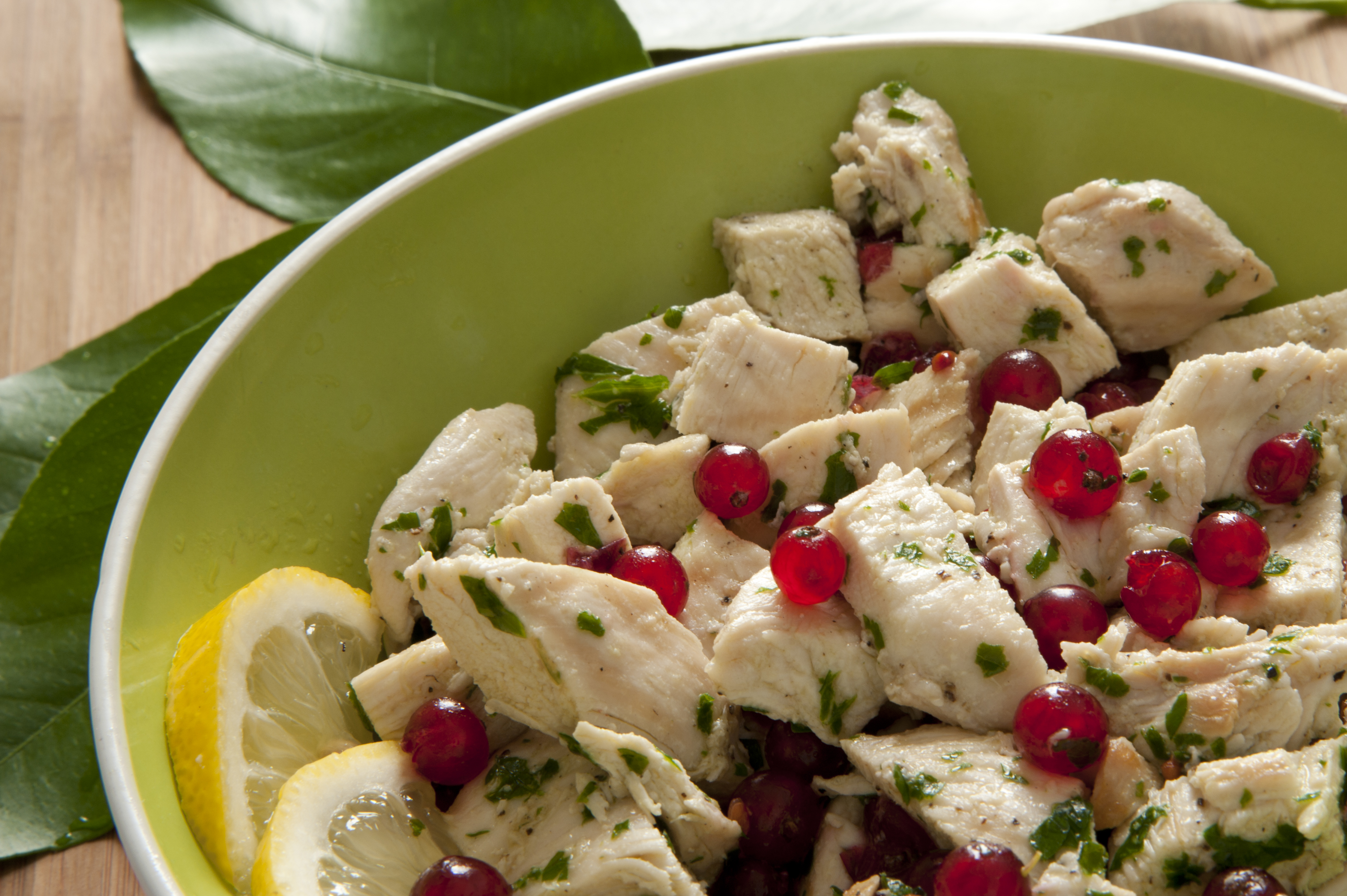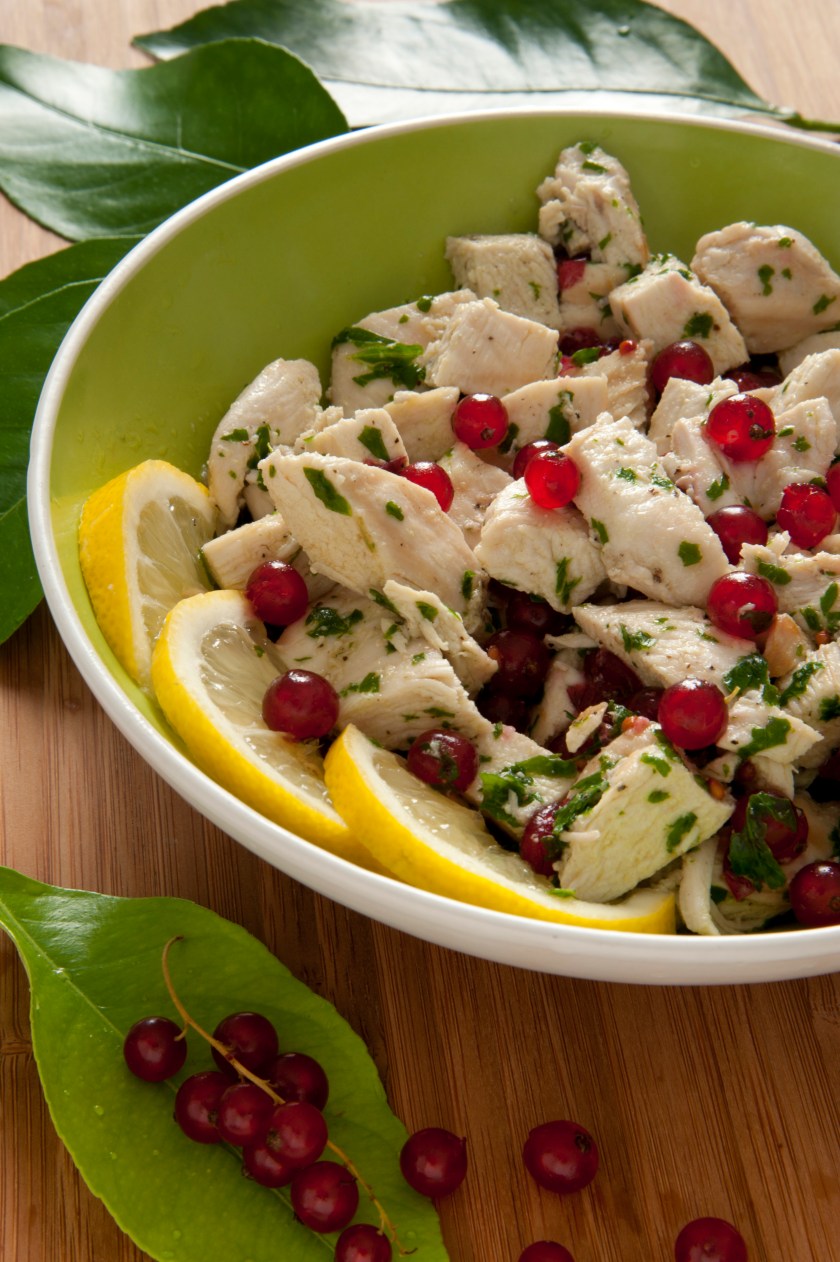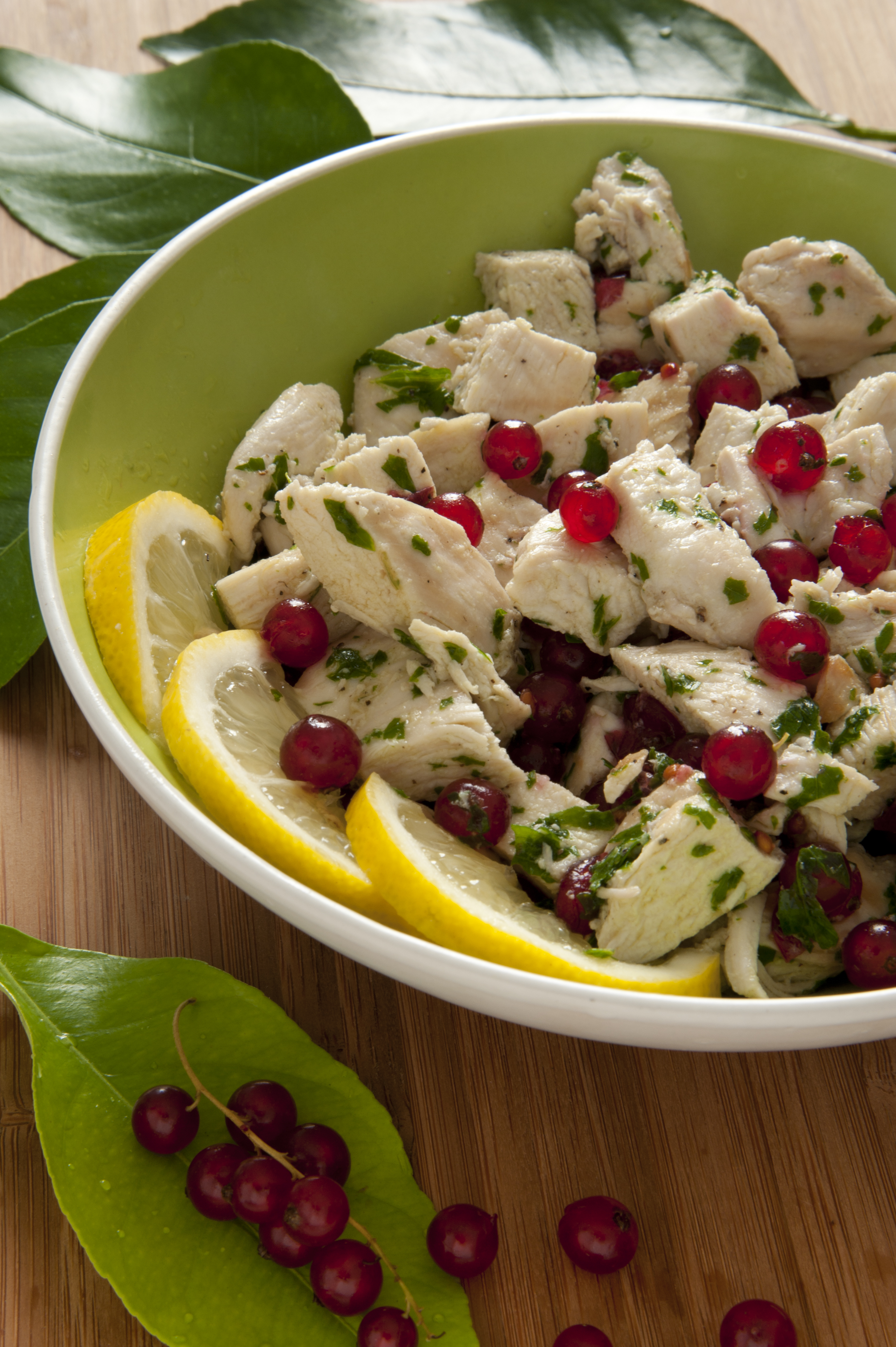 Cuocere il petto di pollo in poca acqua salata, scolarlo e lasciarlo raffreddare (in alternativa si può cuocere sulla griglia, oppure friggerlo con un paio di cucchiai d’olio, ma io mi sentivo salutista!). Lavare bene i ribes e lasciarli macerare qualche minuto con lo zucchero e qualche goccia di limone. Tagliare il pollo a pezzettini e metterlo in una insalatiera. Aggiungere i ribes, spruzzare con limone e prezzemolo, sistemare di sale e pepe e servire.