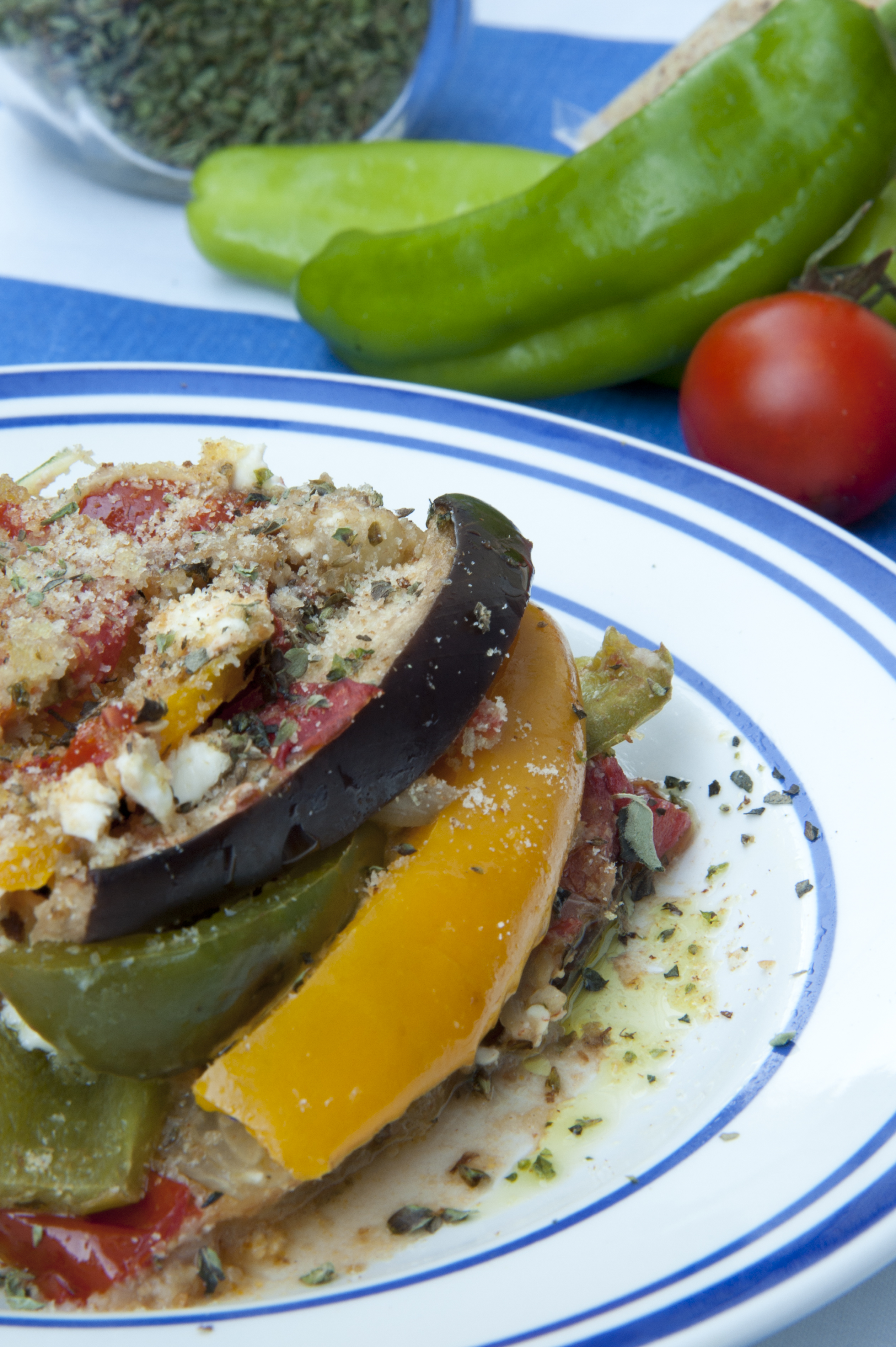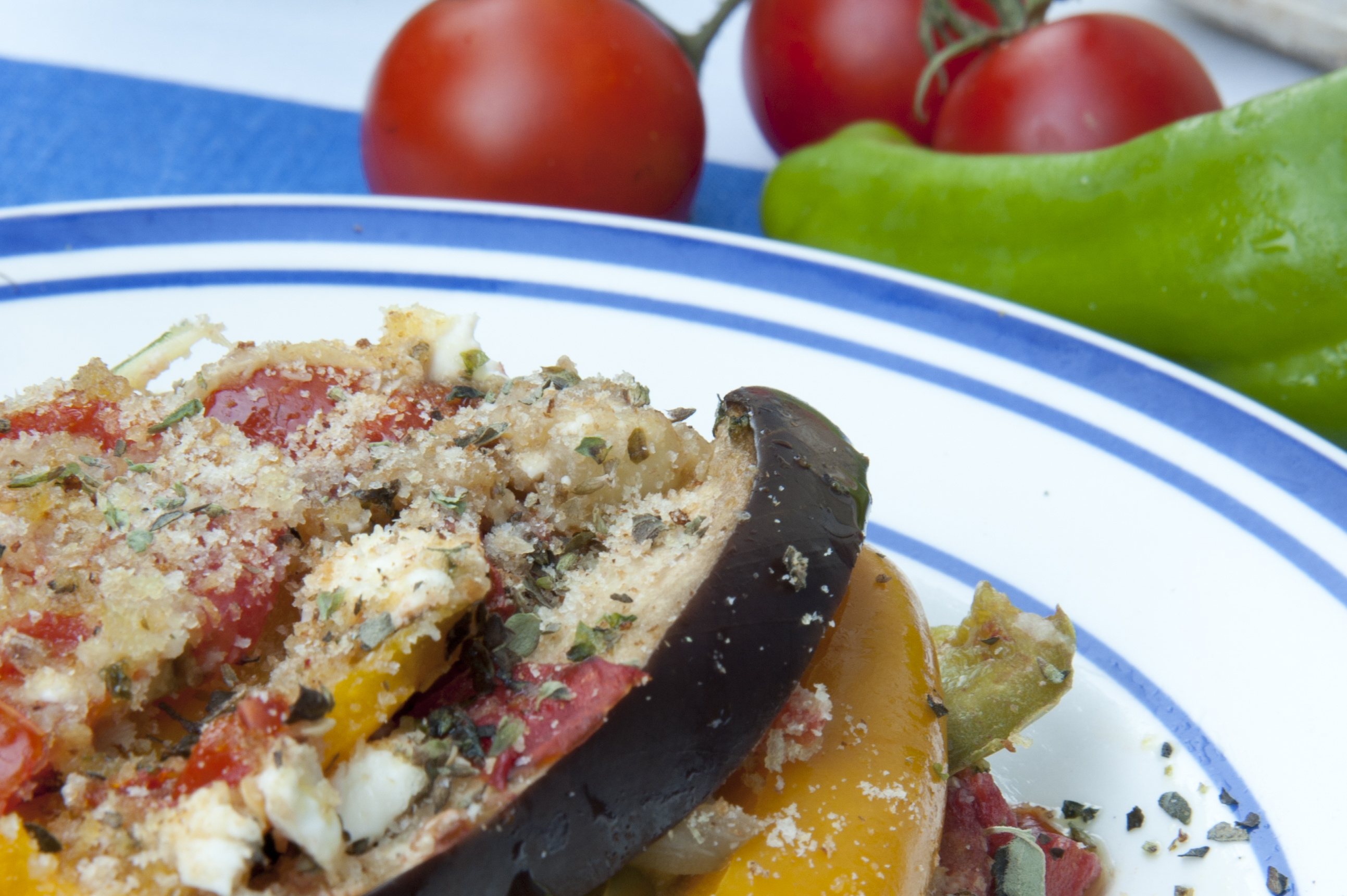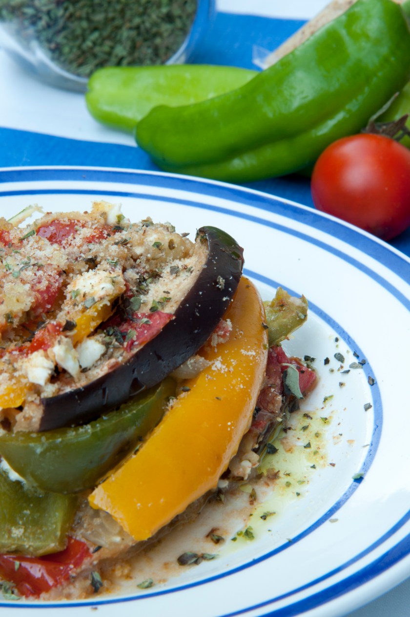Lavare tutte le verdure e tagliarle: i peperoni e la melanzana in fette, i pomodori a cubetti, la patata e la cipolla a rondelle molto sottili. Grattugiare la scamorza, oppure ridurla in quadrotti molto piccoli. Irrorare d’olio una piccola teglia e stendervi le verdure a strati, inframezzando uno strato e l’altro con il formaggio qualche cubetto di pomodoro e fettine di cipolla. Aggiungere ogni volta un filo d’olio, l’origano ed una presa di sale. Arrivati all’ultimo strato completare con le melanzane, ricoprendole con il pomodoro ed il formaggio rimasti. Condire con olio e sale e cospargere con il pangrattato. Infornare a 180 ° per almeno 40 minuti. Servire le verdure come contorno, calde, fredde o tiepide, in base alla stagione.