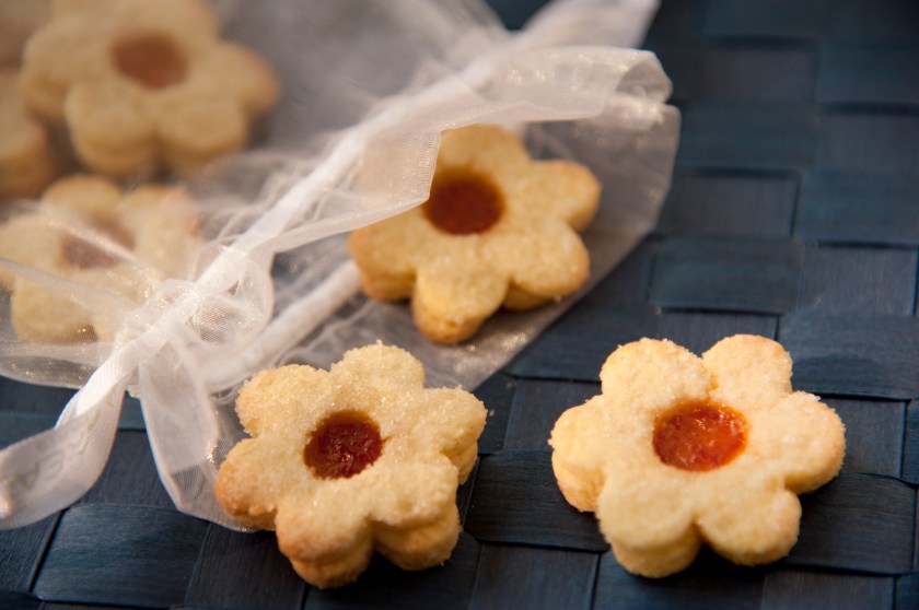 Impastare velocemente la farina, il burro, le uova, gli 80 gr di zucchero, il lievito e i semi di mezza stecca di vaniglia. Porre la palla di frolla a riposare in frigo nella pellicola. Passati dai 30 ai 60 minuti, prendere la frolla e aiutandosi con la farina stenderla sottile, dello spessore di 3, 4 mm al massimo. Ricavare dei fiori in numero pari. Per metà, inciderli nel centro (io uso sempre il levatorsoli, ma banalmente andrebbe bene anche il tappo di un grosso pennarello ben lavato). Sui fiori intatti porre la punta di un cucchiaino di marmellata. Chiudere ogni fiore farcito con un fiore forato, dopo averlo passato su un lato nello zucchero a grana grossa, premendo bene in modo che lo zucchero stesso aderisca bene. Infornare e cuocere a 180° per 25 minuti.