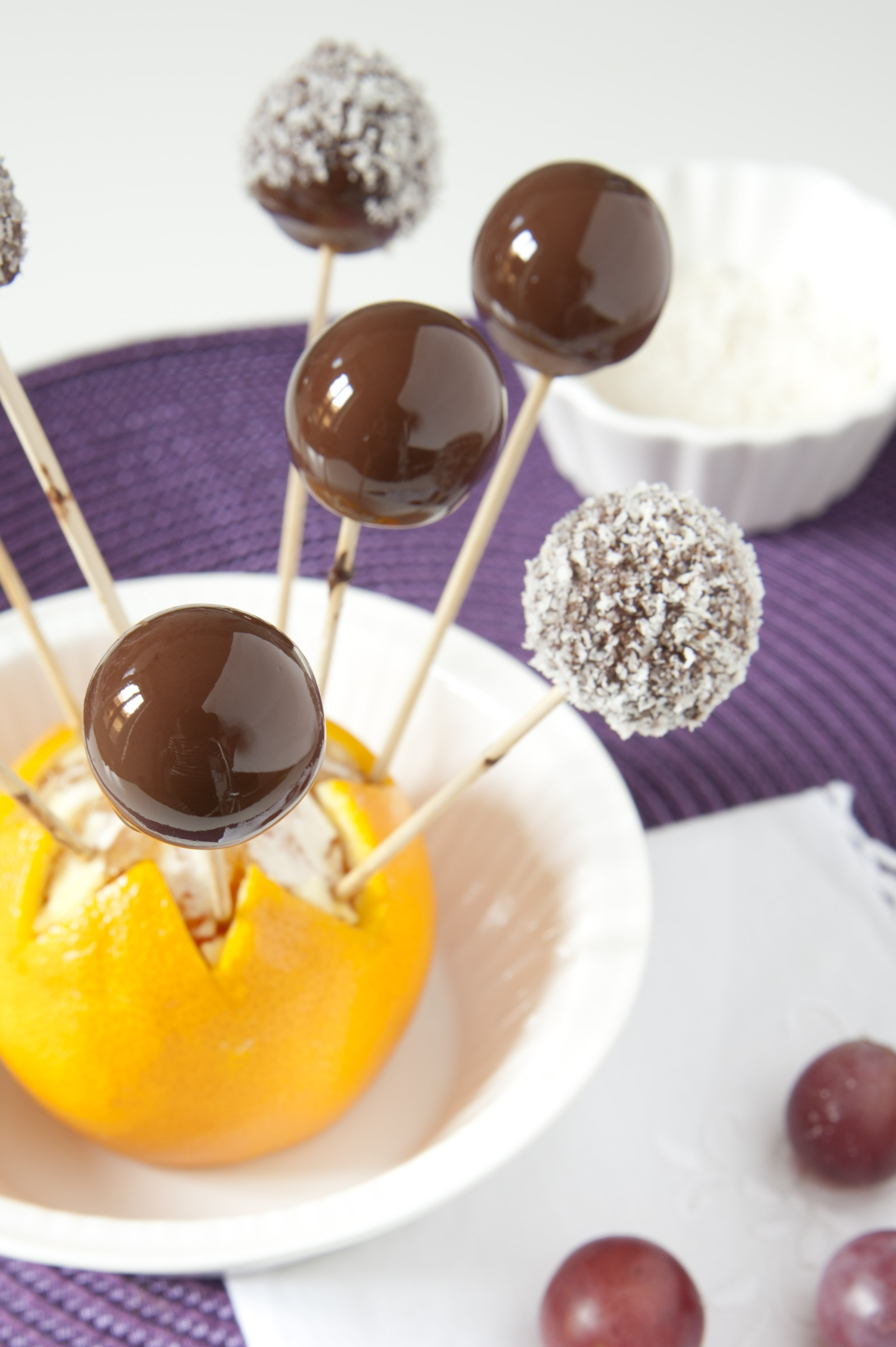 Lavare gli acini d’uva e le arance. Tagliare il culetto delle arance orizzontalmente, in modo che possano stare comodamente in equilibrio su un piatto da portata. Far fondere il cioccolato fondente a bagno maria, tagliandolo al coltello molto finemente. Inserire in ogni acino uno stuzzicadenti e passare ogni chicco nel cioccolato in modo da immergerlo bene tutto. Far colare il cioccolato in eccesso battendo leggermente lo stecchino sul bordo di un piatto fondo e poi inserirlo nella prima arancia. In base ai gusti, una volta che gli acini ricoperti di cioccolato avranno riposato qualche minuto, intingerne la quantità desiderata nel cocco disidratato, roteando lo stecchino con le dita, in modo da ricoprire bene tutta la superficie. Riposizionare sull’arancia e lasciar riposare, meglio in frigo se si riesce, per qualche ora.