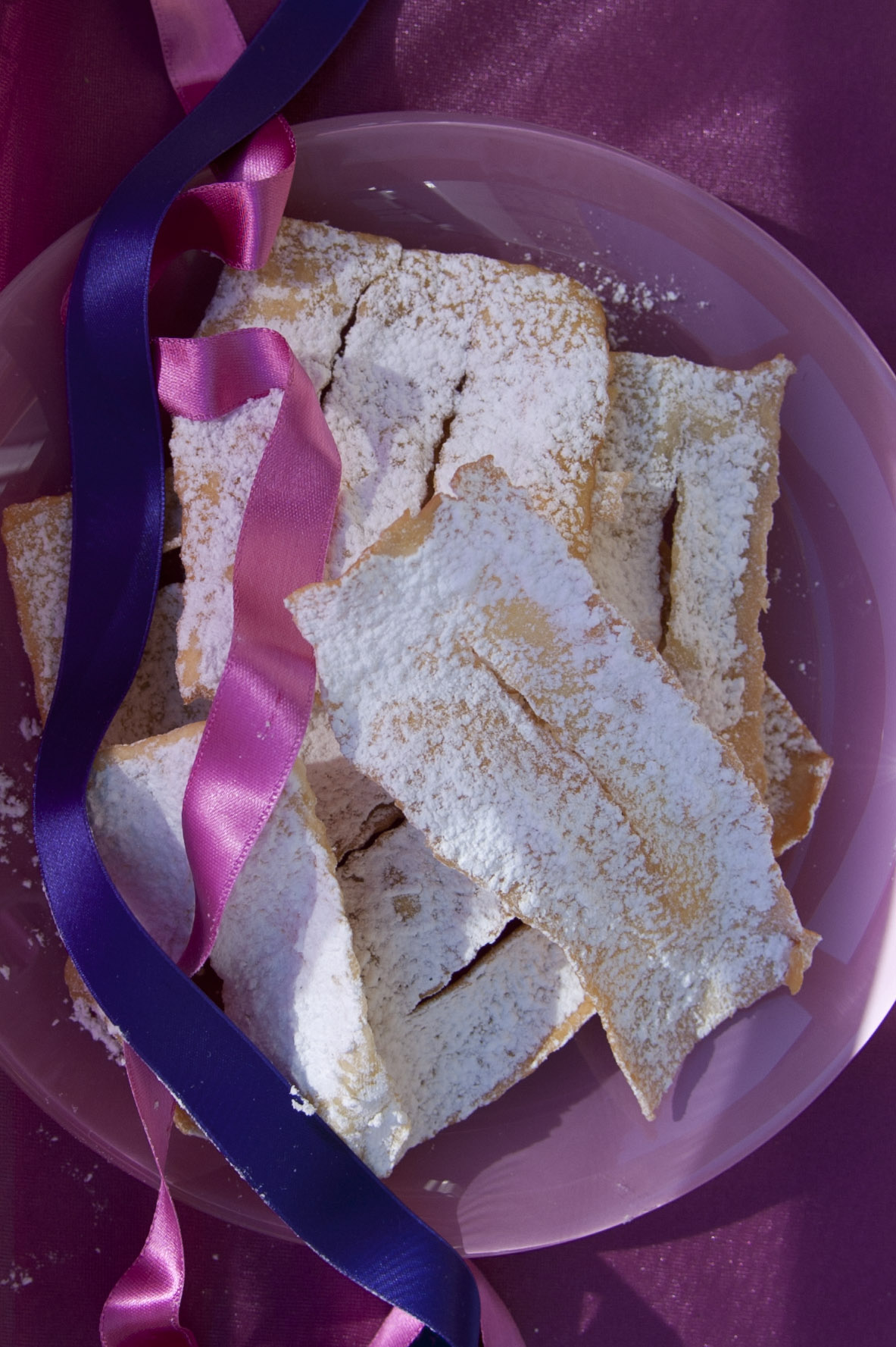 Ho messo farina e lievito nell’impastatrice, ho aggiunto il burro, le uova, lo zucchero e la vanillina, un pizzico di sale e la grappa. Ho impastato tutto per 10 minuti. Ho raccolto la pasta, ne ho fatto una palla e l’ho messa in frigo a riposare per 30 minuti. Una volta pronta l’ho divisa in 5-6 parti e le ho tirate una ad una a sfoglia, usando la macchinetta per tirare la pasta. Il sistema che ho utilizzato è identico a quello che prediligo per fare la pasta all’uovo: un paio di passate tra i rulli aperti al massimo, poi la chiudo a libro in 3 parti e la tiro inserendola dalla parte delle pieghe, chiudendo i rulli al foro 3 o 4. Ripeto un’altra volta e infine la tiro molto sottile, una parte anche utilizzando lo spessore minimo della macchinetta. E’ ovvio che si possono fare anche usando il matterello, ma io non sono mai riuscita a farle sottili al punto da risultare leggere, come invece avviene riducendo la sfoglia sottilissima con la macchinetta. Di volta in volta pronte le strisce di sfoglia, le ho tagliate in rettangoli larghi 8 cm e lunghi 12 con una rotella seghettata (la mia non funzionava granchè… mi chiedo ancora per quale ragione). Li ho incisi in due punti in senso verticale ed infine li ho fritti in olio ben caldo (tra i 160° e 180° C… eh eh, ho usato l’Igrill per regolare la temperatura dell’olio). Io uso un olio di mais noto e costoso e mi trovo sempre molto bene. Credo che su dolci come questi, la qualità dell’olio incida parecchio. Ho lasciato friggere le chiacchiere per mezzo minuto ciascuna, rigirandole e senza farle dorare. Le ho disposte su un vassoio e le ho cosparse con abbondant(issimo) zucchero a velo.