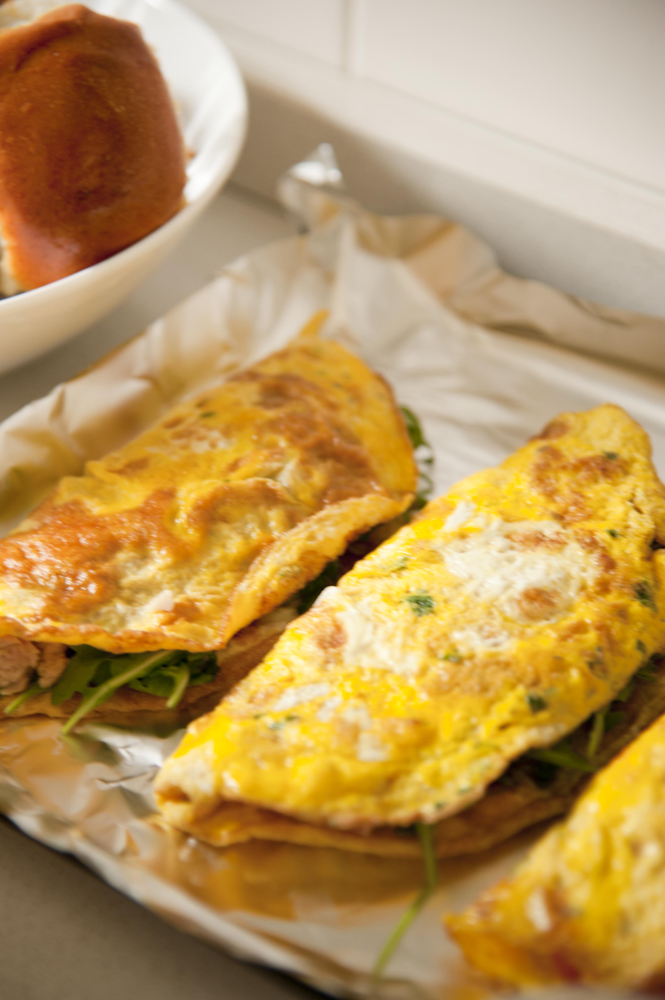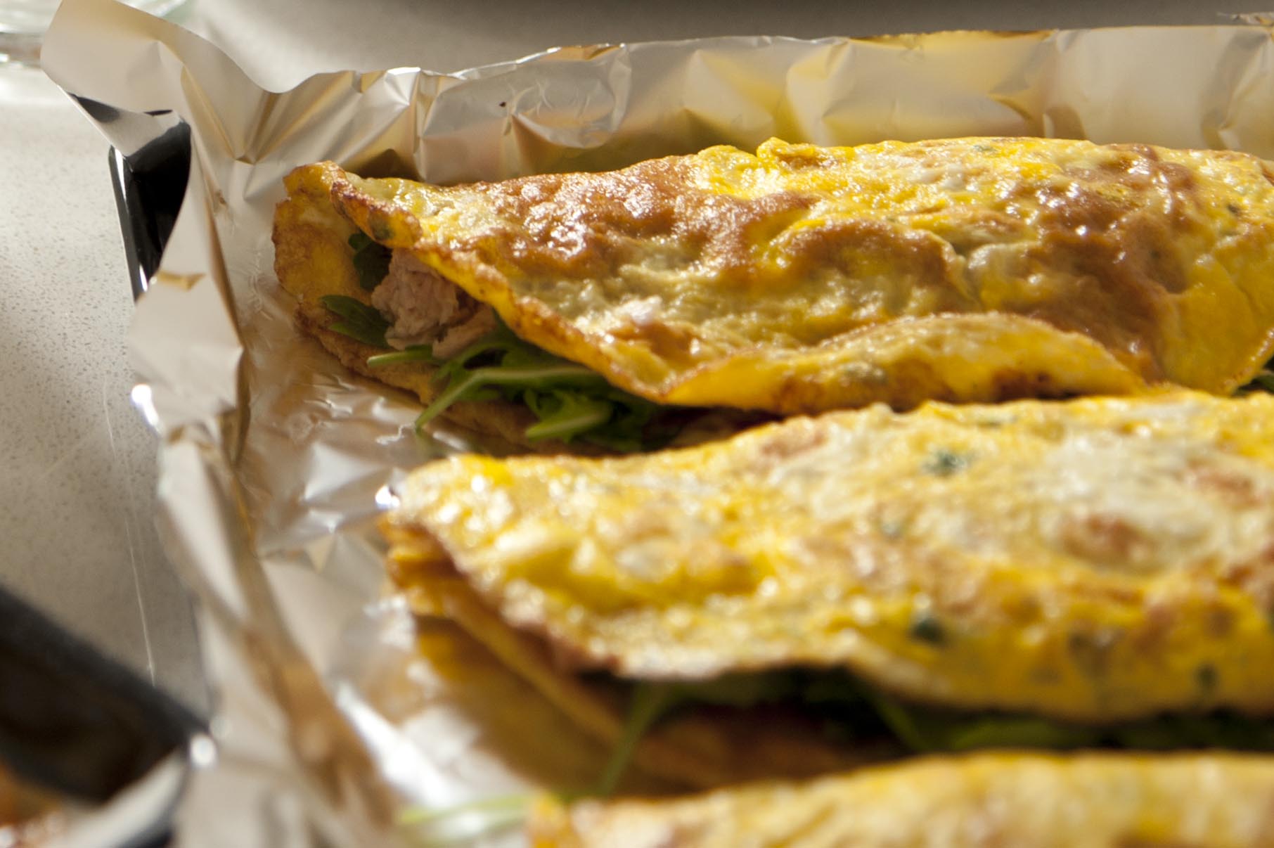 Aprire le uova e metterle tutte e 4 in una ciotola. Aggiungere una presa di sale e mescolare brevemente. In un padellino antiaderente far sciogliere metà del burro e aggiungere le uova sbattute, solo la quantità necessaria a ricoprire tutto il fondo della padella e ad avere circa 5 mm di spessore. Lasciar cuocere per qualche minuto a fiamma vivace, muovendo la padella orizzontalmente in modo che l’omelette risulti poi facile da voltare. Io non sono un mostro di bravura in queste cose, quindi le faccio piccole, in modo che poi risulti semplice voltarle semplicemente usando una paletta. Rigirare quindi l’omelette e lasciarla cuocere altri due minuti. Toglierla dalla padella e farla riposare su un piatto. Imburrare di nuovo il padellino e ripetere l’operazione. Con 4 uova ho fatto 4 omelette. Una volta pronte le ho farcite come segue: 2 con pomodorini tagliati a spicchi sottili, rucola e uno strato di formaggio cremoso, 1 con prosciutto e formaggio, l’ultima con patè di olive, lattuga a striscioline e feta sbriciolata. Le ho piegate a metà e messe in una pirofila da forno, pronte per essere appena riscaldate prima di essere servite.