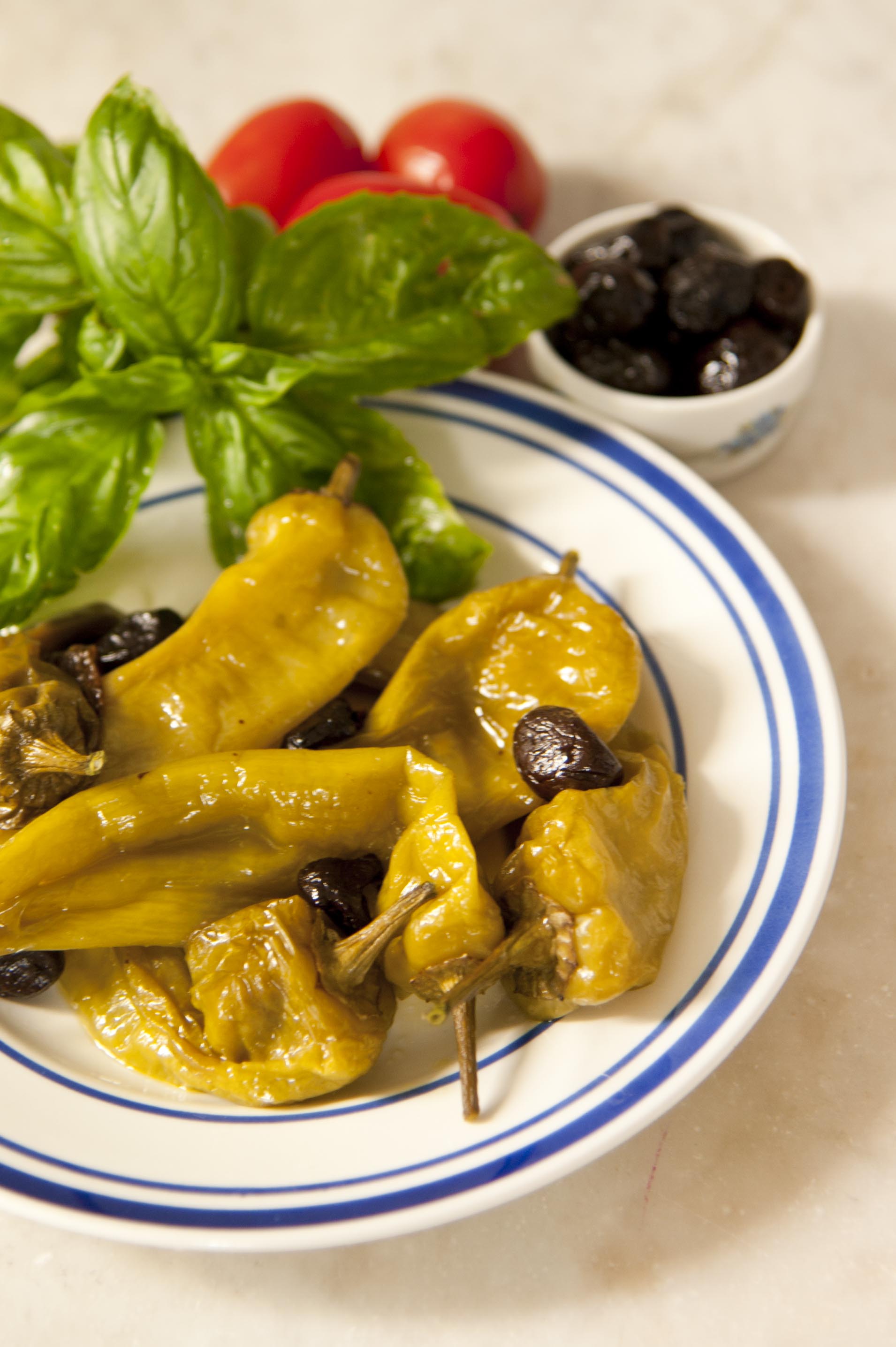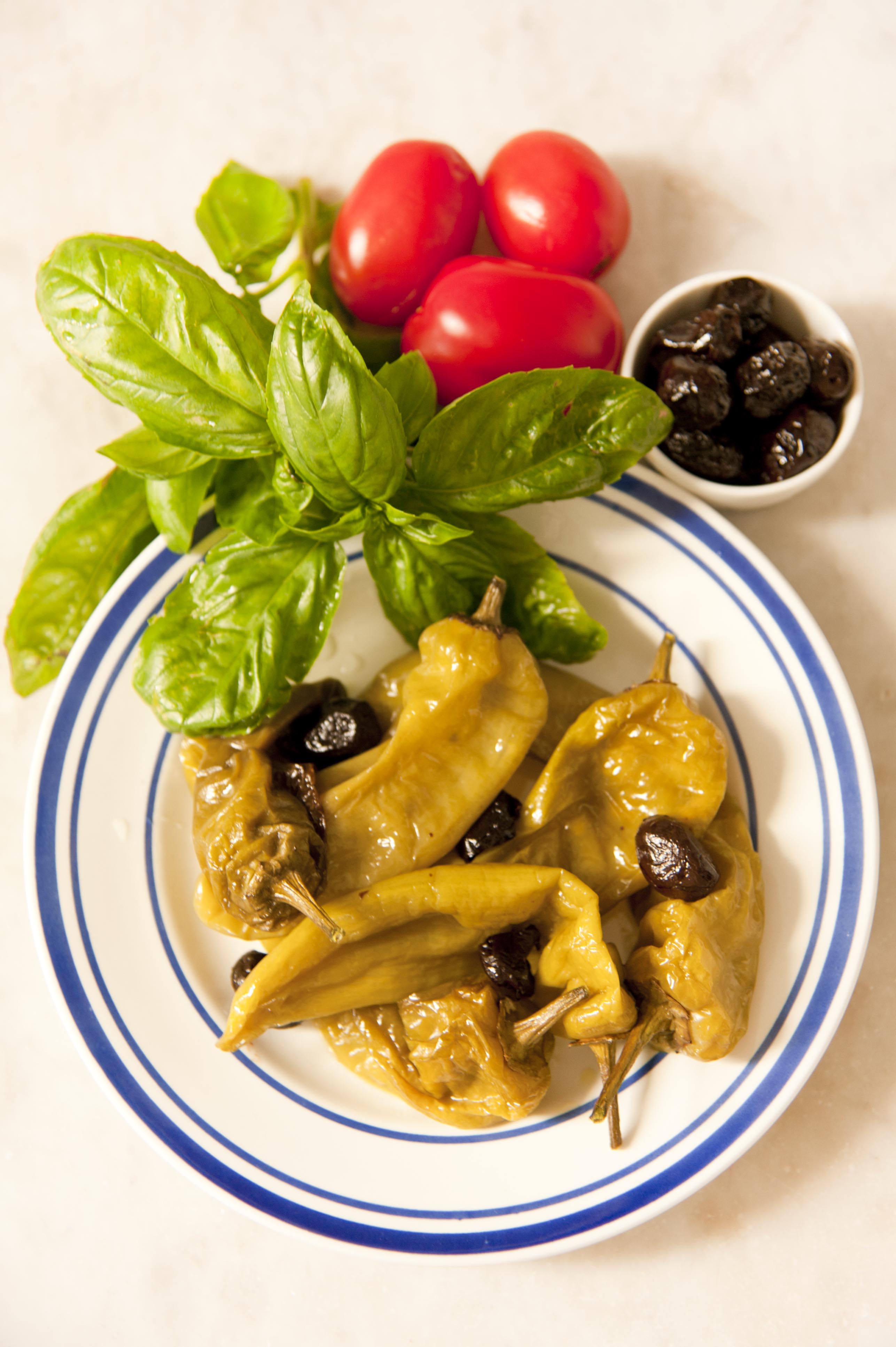 Ungere una padella antiaderente e porvi i peperoni, interi, ben lavati e con il loro picciolo. Salare (poco, perchè sia le olive che i capperi non scherzano in quanto a sapidità). Lavare i capperi e aggiungerli ai peperoni insieme alle olive. Friggere il tutto a fuoco vivace, finchè i peperoni non siano leggermente appassiti. Avranno quindi alcune parti verde vivo ed altre più scure. L’obiettivo è quello di tostarli, quasi, senza che si brucino o anneriscano. In tutto ci vorrano 13/14 minuti. Servire bollenti s pane tostato, con pomodori a fettine e basilico freschi di frigorifero ravvivati con un goccio d’olio e una spolverata di sale.