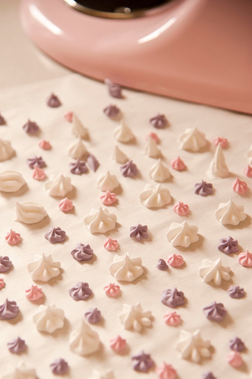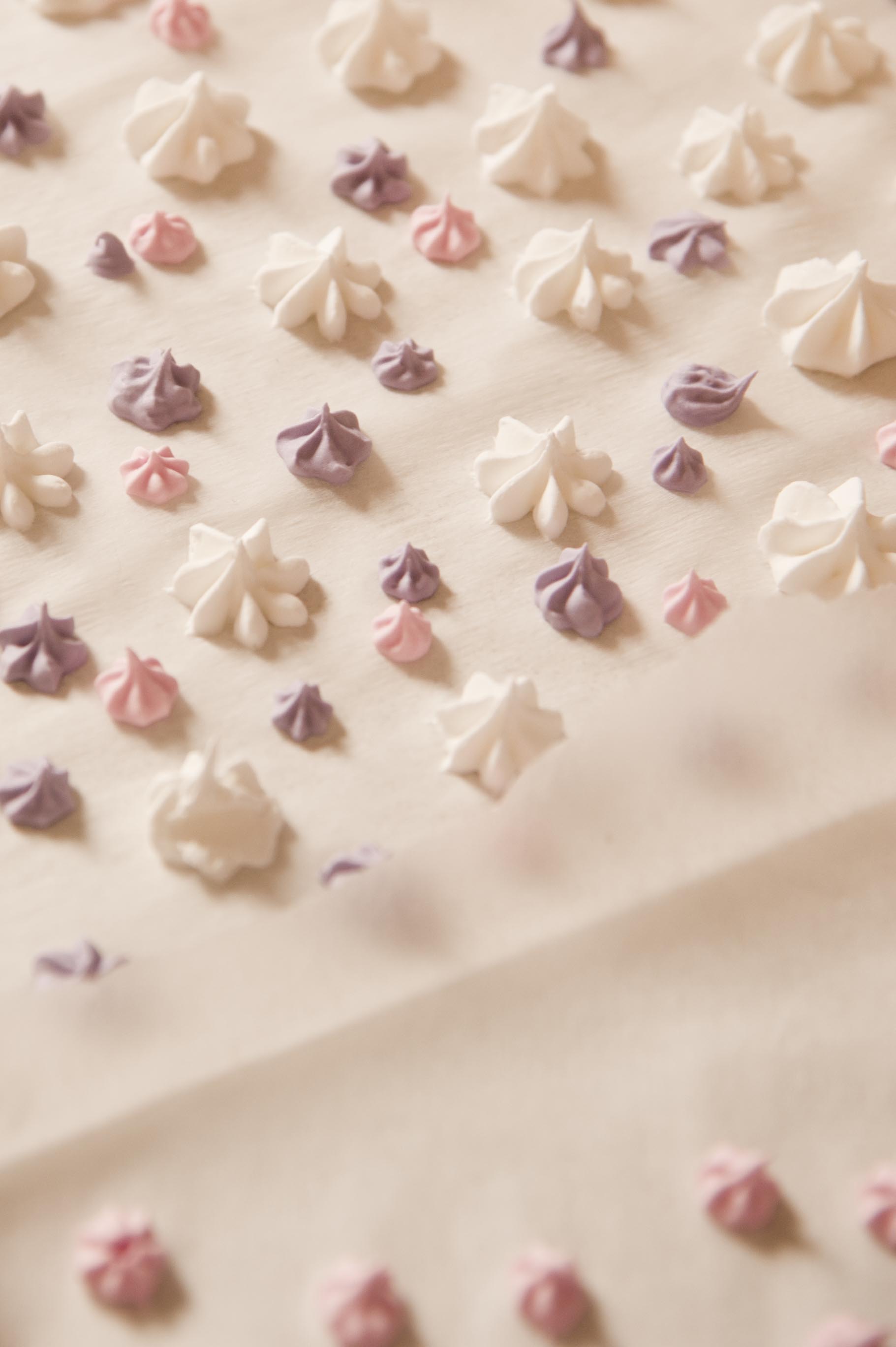Mettere lo zucchero a velo, il limone e l’albume nell’impastatrice usando il gancio a frusta. Azionare e lasciar che monti tutto per almeno 15 minuti. Anche se sembra impossibile, ad un tratto avremo una pasta montata, molto simile al dentifricio. La frusta deve lavorare a buona velocità, ma non alla massima potenza. Una volta terminato dividere l’impasto in 2 o 3 parti, in base al numero di differenti colori che si desidera ottenere. In ogni ciotolina inserire pochissima polvere di coloranti (se in polvere, che sono costosi, rari, ma molto efficaci) oppure 2/3 gocce di colorante in gel. Sconsiglio quelli liquidi del Super, anche se per un rosa o azzurro o verde tenui perchè non provare (ma stando davvero indietro con la quantità per non smontare l’impasto). A questo punto con la Santa pazienza di cui disponete, riempite la sac à poche e formate i fiori: basta tenerla perfettamente perpendicolare alla carta forno che si sarà posizionata sul piano di lavoro. La punta a stella fitta deve quasi toccare la carta forno, spremendo sollevare con un gesto rapido la sac à poche. Voilà (vabbè, al mio settecentesimo tentativo son quasi riuscita). Per ottenere i ciuffetti bianchi (nella foto qui sopra, in basso) compiere lo stesso gesto, ma spostando orrizontalmente la bocchetta mentre si spreme (un gesto di 2 secondi, facile, no?!). La Royal Icing impiega almeno 3/4 ore per asciugare e si conserva a lungo.