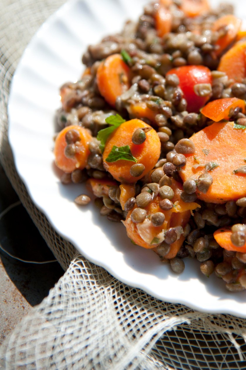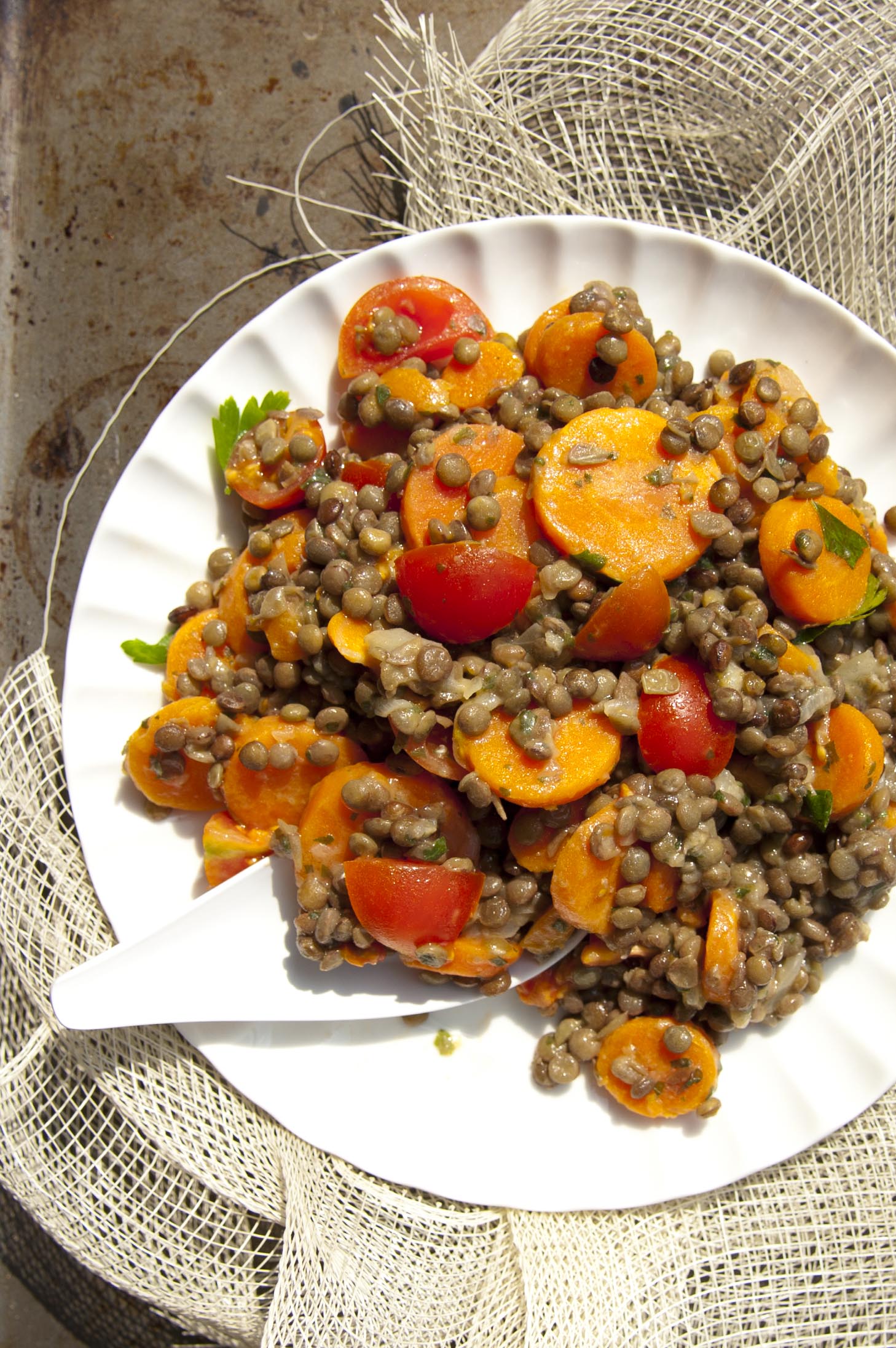Soffriggere la cipolla in olio extra vergine di oliva. Unire le carote, lavate, mondate e tagliate a rondelle spesse 4 mm. Lasciarle ammorbidire a fiamma media. Una volta pronte, aggiungere le lenticchie (se in scatola e non cotte al vapore, devono essere scolate del liquido di governo, se bollite, devono essere ben al dente e prive di liquido) salare, pepare e lasciar insaporire il tutto per una decina di minuti. Aggiungere infine i pomodorini tagliati a quarti. Spolverare con prezzemolo tritato grossolanamente e servire, calde, tiepide o fredde.