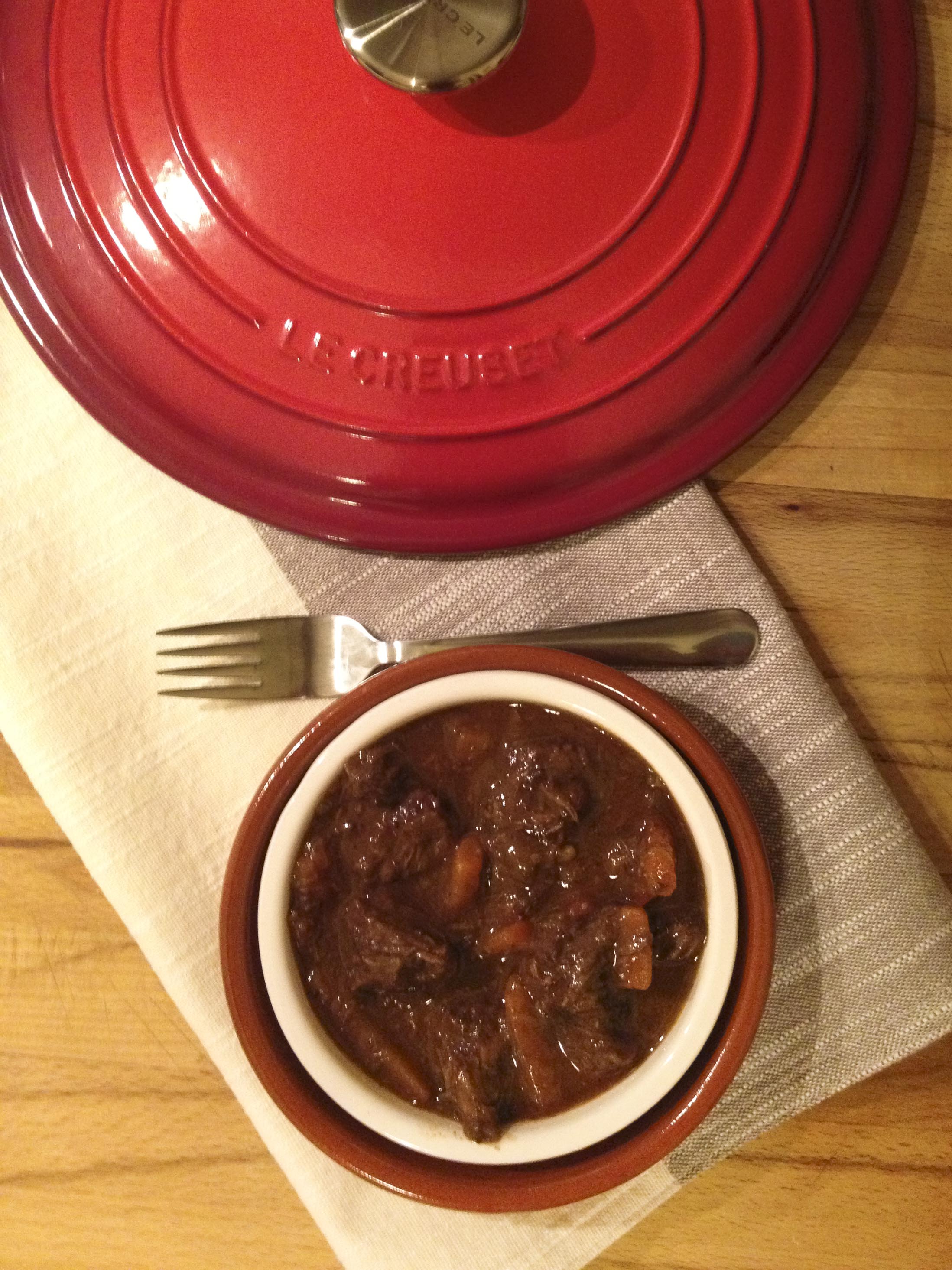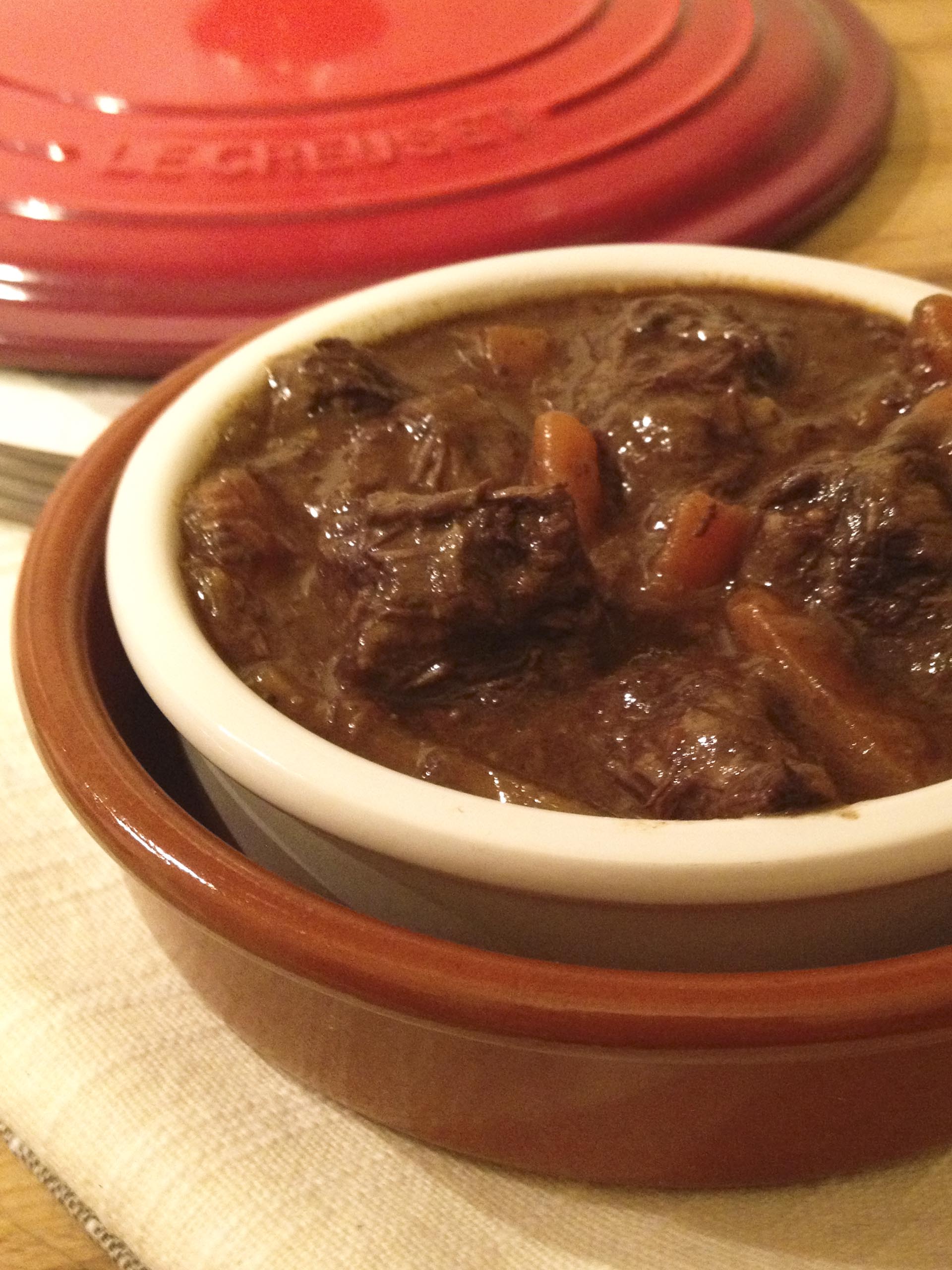 Anche se ho il libro di Julia Child, la ricetta l’ho copiata pari pari da qui, perchè ho avuto qualche dubbio nel tradurla da me, soprattutto sulle dosi e la tipologia degli ingredienti. Tuttavia, se posso aggiungere a questa versione un mio consiglio personale, la prossima volta io invertirò le quantità di brodo e vino. Questa versione (e comunque il testo originale, di questo sono certa), prevede una bottiglia intera di vino, ma in questo modo il risultato ha un sapore un po’ amaro, anche se nel complesso delizioso. Quindi consiglio di aggiungere 500 ml di vino e 750 ml di brodo, per ottenere un risultato di sapori un po’ più equilibrato. In ogni caso, questa ricetta non ha nulla di ‘americano/francese’, credo sia totalmente universale, è veramente delizioza e la rifarò presto, alla prima occasione speciale. Altra cosuccia, che voglio dire per essere corretta e sincera fino in fondo: lo chef con cui lavoro, per lavoro, mi ha detto che a suo avviso la cottura in forno è un dispendio di energia elettrica inutile, perchè il risultato sarebbe identico tenendo la pentola sul fuoco bassissimo e cuocendo per lo stesso numero di ore. Ok, forse però la soddisfazione non sarebbe la stessa, io mi sono proprio sentita Julie nell’estrarre la Creuset dal forno rovente :)