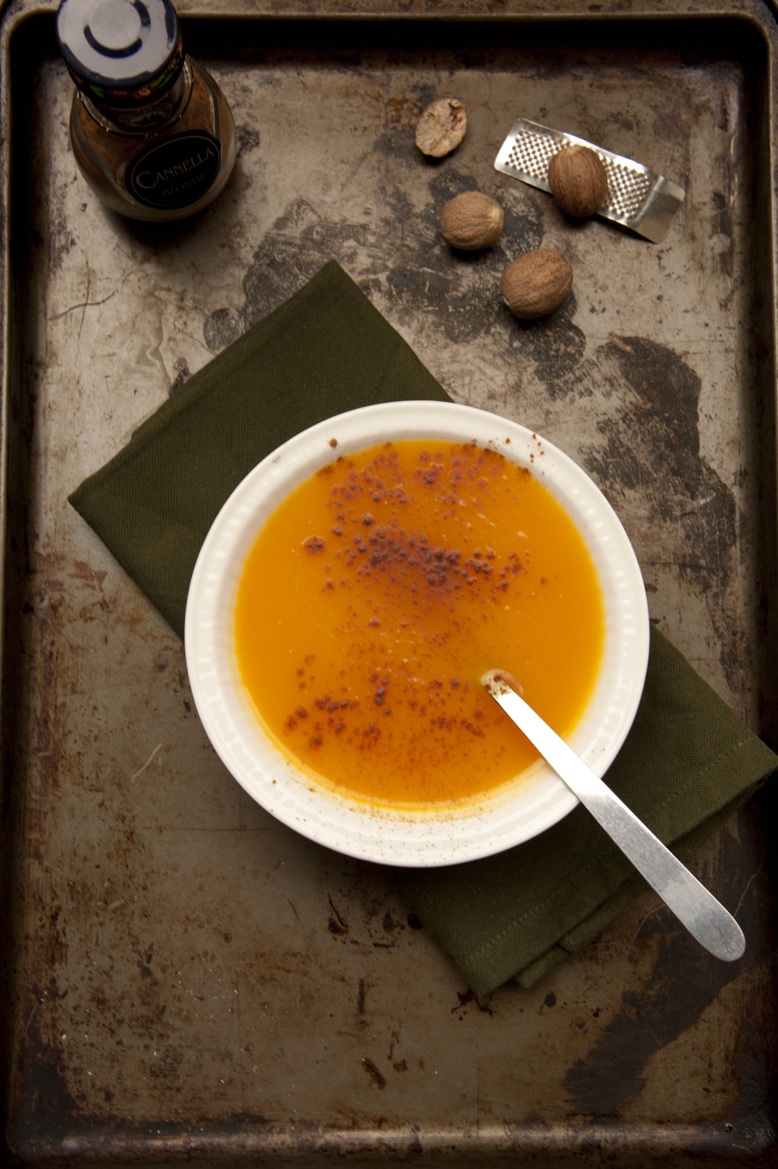 Far soffriggere la cipolla in poco olio e quando sarà bella morbida e appassita, aggiungere la zucca tagliata a pezzetti. Io l’ho avuta intera e bella grande e lunga e mi hanno consigliato (il Signor Pino) di tagliarla prima a metà orizzontalmente e poi di proseguire tagliando le due parti ottenute verticalmente (banalmente: l’ho tagliata in 4 parti). Era piuttosto dura, quindi ho rischiato la vita, ma ne è valsa la pena: dentro era bellissima e di un colore magnifico. Ho preso una delle 4 parti e l’ho tagliata a fette più sottili alle quali ho poi potuto togliere la buccia abbastanza facilmente (come avrei fatto per pulire un melone). Aggiungere subito anche la patata in pezzi, lavata e sbucciata. Ho lasciato insaporire il tutto per qualche minuto e poi ho aggiunto un bicchiere di brodo. Una volta che zucca e patata si sono cotte (circa 30 minuti), ho frullato il tutto con il minipimer, scegliendo la consistenza per me ideale allungando la crema con il latte. A questo punto ho salato e pepato e aggiunto una grattata abbondante di noce moscata. Infine una spolverata di cannella (quest’ultima direttamente nel piatto in cui ho servito la crema, se piace). Ovviamente va a nozze anche con il formaggio grattugiato o dei crostini… ma ho risparmiato calorie.