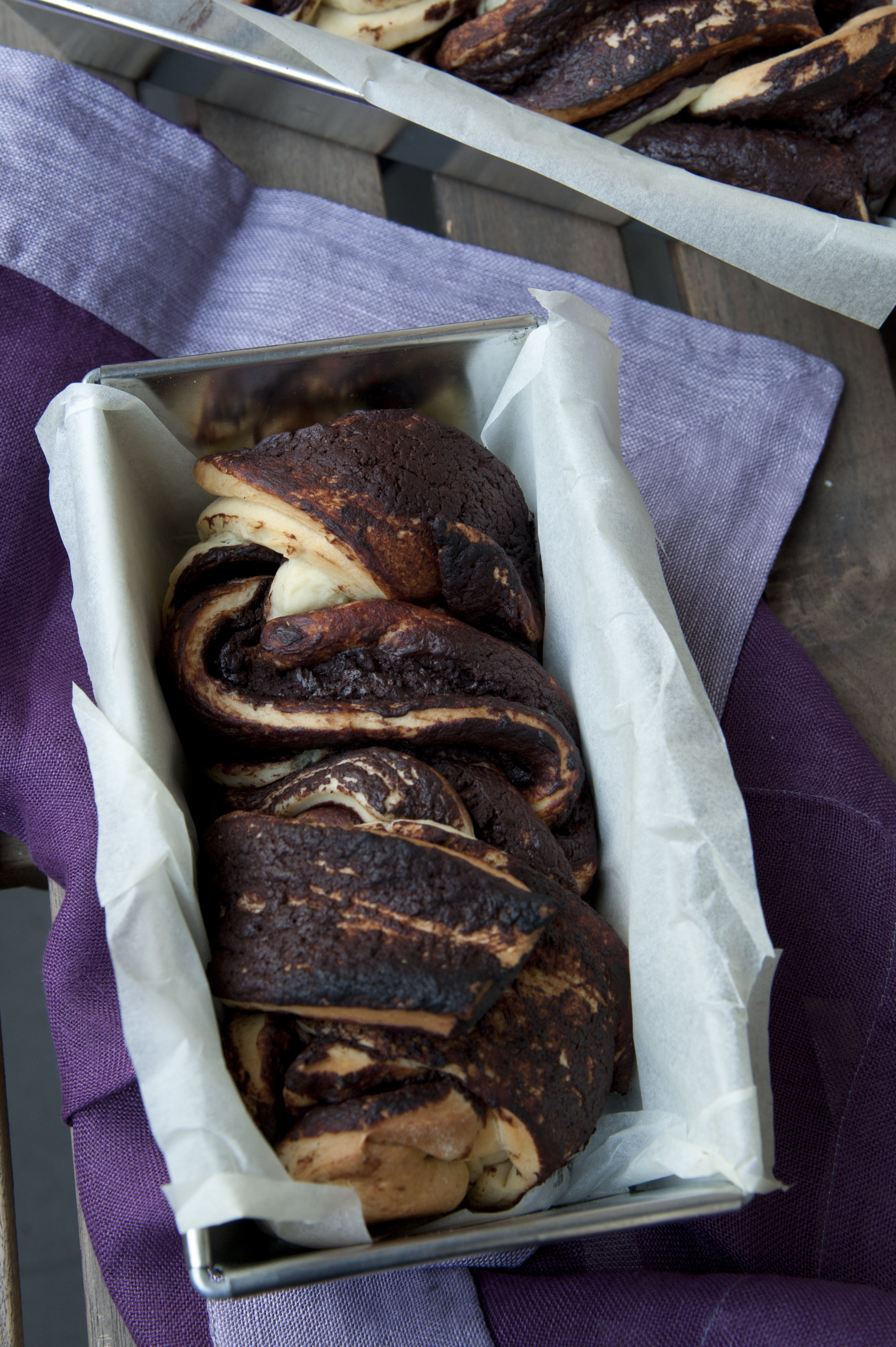 Sciogliere il lievito nel latte intiepidito. Aggiungere il composto alla farina e impastare brevemente. Aggiungere l’olio, l’uovo, lo zucchero e impastare ancora. Deve risultare un impasto liscio ed elastico, quindi se è necessario, aggiungere altra farina. Infine aggiungere il sale. Porre in una ciotola capiente infarinata, coprire con un canovaccio e lasciar lievitare da 60 a 90 minuti. Fondere il cioccolato in un piccolo tegame insieme al caffè. Stendere l’impasto in una sfoglia sottile 4 mm e dividerla in due rettangoli. Spennellare i rettangoli con il cioccolato tiepido (io ho esagerato, avrei dovuto usare meno cioccolato) e arrotolare ciascuna sfoglia per il senso della lunghezza. Foderare due stampi da plumcake con della carta forno. Tagliare i due rotoli a metà nel senso della lunghezza e intrecciarli lasciando le parti aperte verso l’alto. Intrecciare tra loro i due mezzi rotoli e porli delicatamente ognuno in uno stampo. Infornare a 180° per 30-40 minuti. Lasciar raffreddare e servire dopo aver lasciato passare qualche ora.