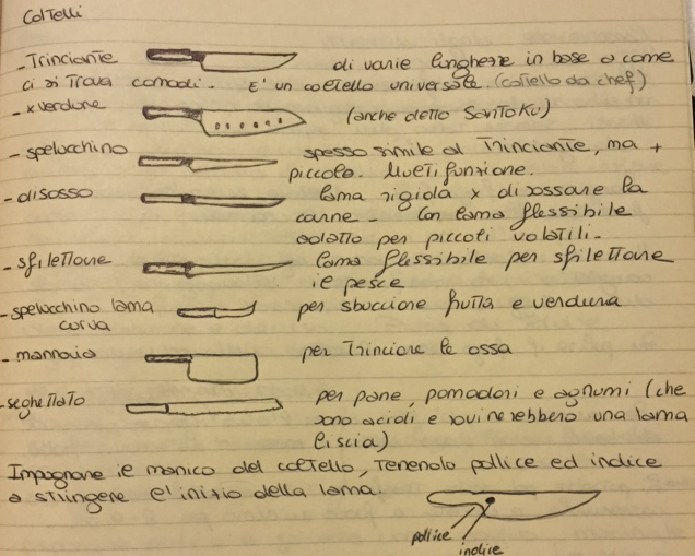 Seratona ragazzi, dopo anni inauguro una nuova sezione del blog (che non legge nessuno, lo so). Come avevo annunciato ho cominciato un corso di cucina professionale e la prima lezione è stata interessante e comica abbastanza, da persuadermi a dare un nome a tutta questa vicenda e a trovarle un divano letto tra queste pagine, curiosa di capire come evolverà il tutto, perchè non ho dubbi che la mia via debba essere quella di cucinare, che questo mi paghi un giorno le bollette, oppure no. Lo Chef mi piace, si vede che è appassionato, inoltre mi sembra di aver capito che è uno sperimentatore, amante delle tecniche moderne: mi ha fatto una tale testa con la ‘cottura sottovuoto’, che naturalmente ho ordinato su Amazon tutta la strumentazione necessaria, che mi auguro non faccia la stessa fine dell’essiccatore, che ora guarda incantato il lampadario della cucina, appollaiato sul mobile più alto che avessi. Entrambi, essiccatore e lampada, guardano me perplessi. Lo Chef è severo, su questo non ho dubbi: durante la prima lezione, dopo avermi descritto l’uso di circa 50 piccoli utensili da cucina e di una decina di coltelli, mi ha messo in mano una sorta di mannaia giapponese e ho affettato così tante verdure che non mi sono più sentita il polso destro per due giorni, questo dopo aver guardato aspramente il mio coltello da cuoco personale, chiedendomi se non mi fossi accorta che la lama era da rifilare. Vabbè, sono stata zitta, ma la risposta è No, non me ne ero accorta. Quel coltello taglia talmente bene rispetto agli altri in mio possesso, che dopo 4 anni mi sembrava ancora come il primo giorno, ok?!