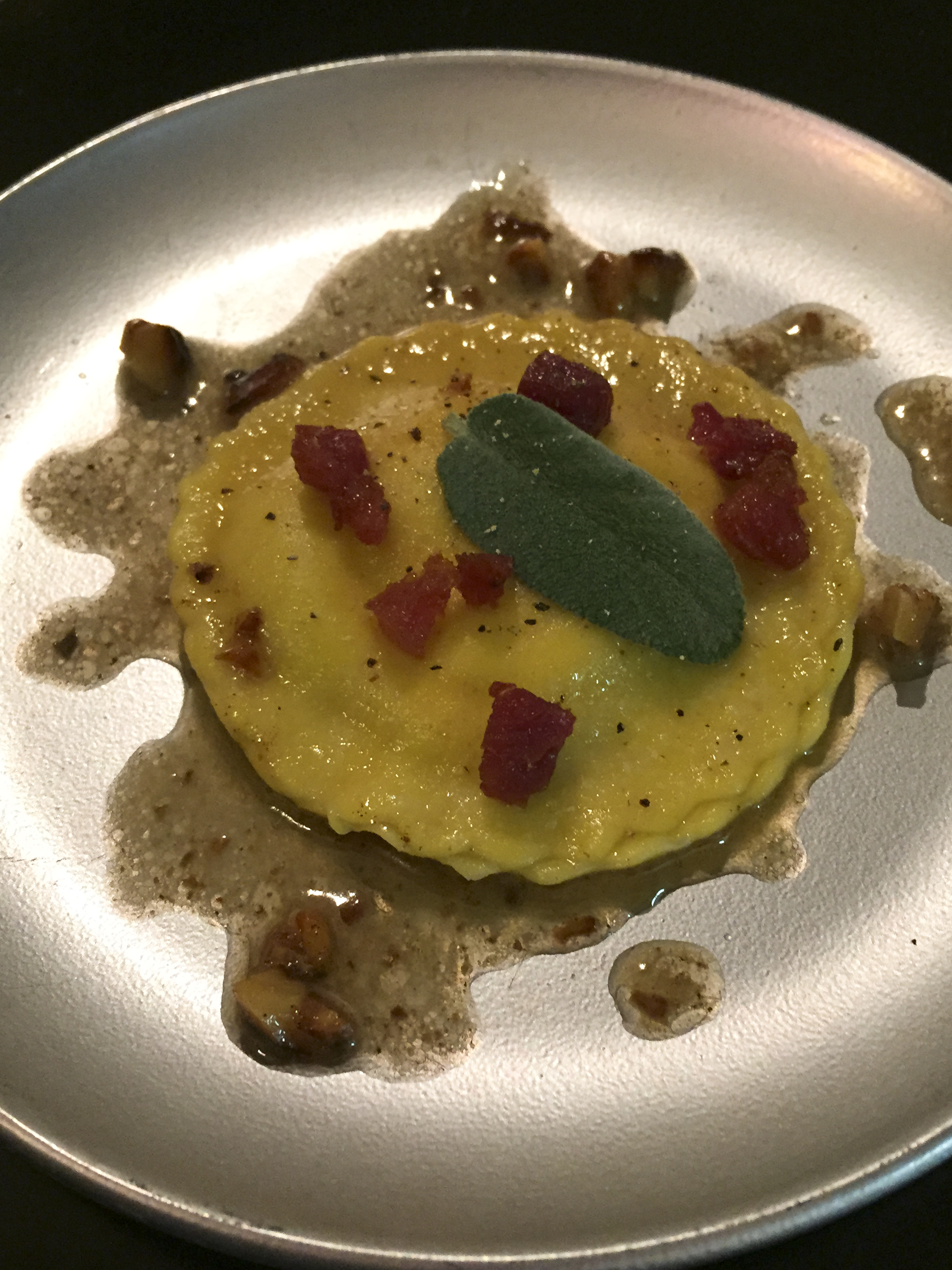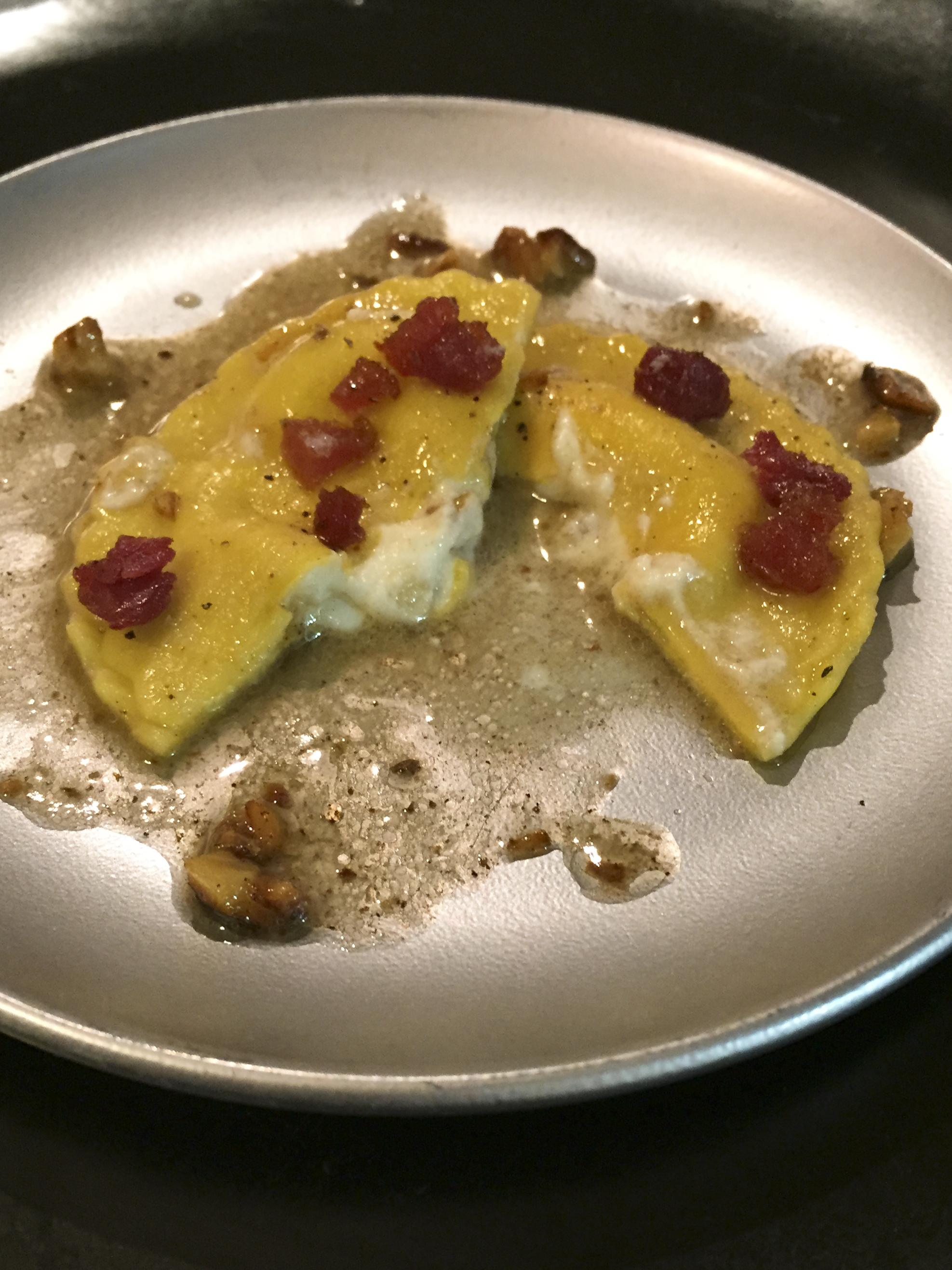 Ravioli al tartufo, con burro nocciola, speck e noci