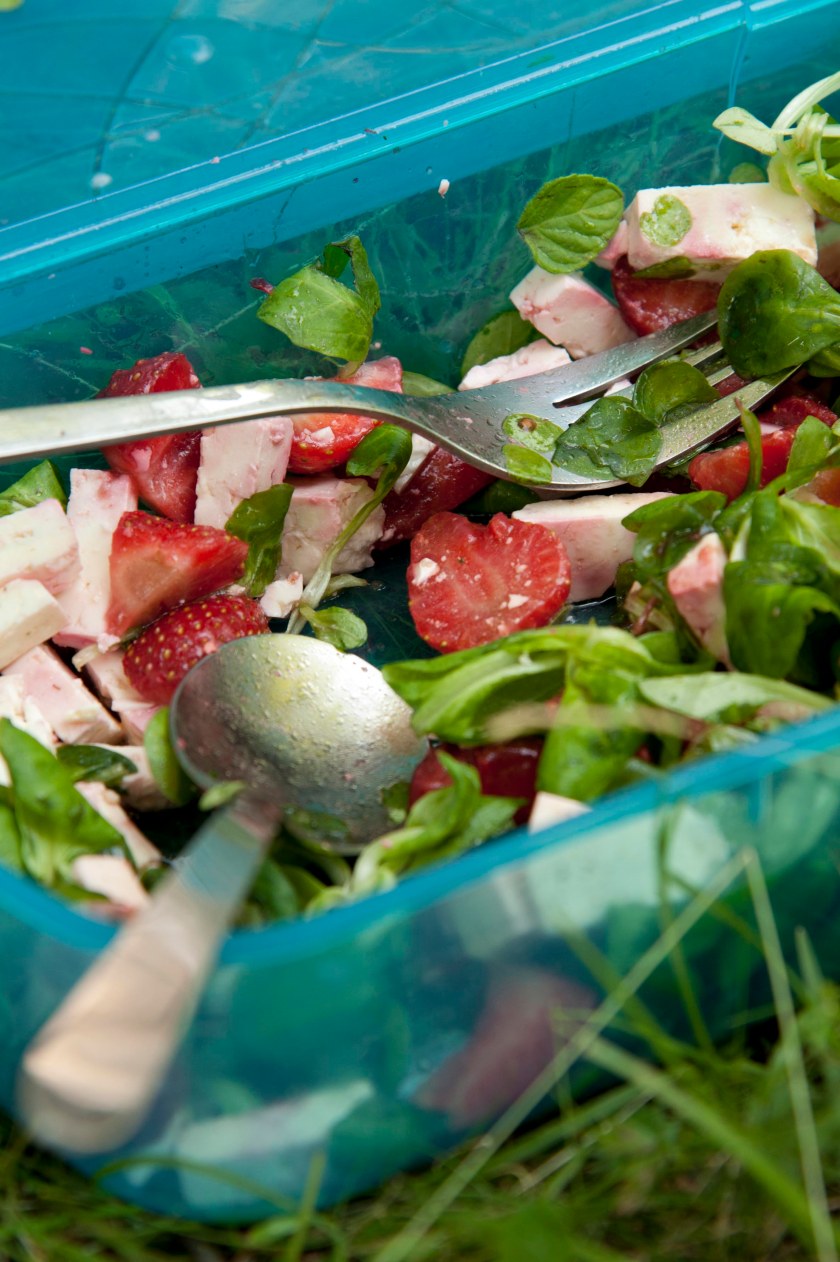 ‘Questo non è un vero post e non ha proprio la pretesa di esserlo, ma siccome manco da un pezzo, non ho voluto aspettare fino a domenica. Almeno così vi lascio un saluto e mi sfogo 2 secondi: oggi al lavoro è stata una giornata pessima! ACCIDENTI, PORCACCIA LA MISERIA NERA e UFFA! CAVOLO (e raffica di altre parole che con la verdura hanno meno a che vedere)! VALERIANELLA, FETA, FRAGOLE E MENTA Ricettina rapidissima preparata in occasione di un pic-nik organizzato con Kika e Paola. La ho provata anche nelle versione con i lamponi e mi è piaciuta moltissimo (e per questa versione ho sostituito il limone con l’aceto aromatizzato all’erba cipollina che mi ha regalato Cinzia). Non ditemi che devo darvi la ricetta, perchè come tutte voi, più abili ed esperte, saprete ho solo mischiato insieme tutti gli ingredienti: insalata valerianella ben lavata, 130 gr di feta a cubetti, 10 fragole pulite e tagliate a pezzetti, mentuccia fresca, olio, sale e il succo di uno spicchio di limone.